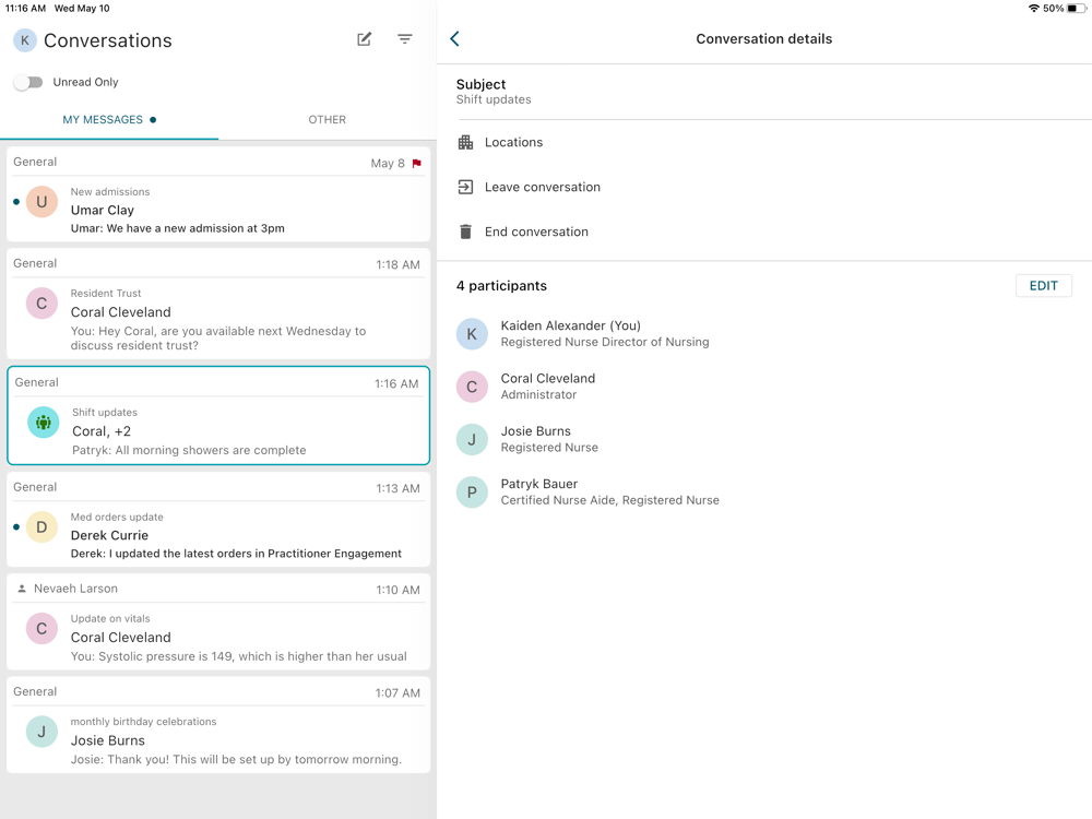 The HIPAA-compliant PointClickCare Secure Conversations application seamlessly integrates with the PointClickCare SaaS-based senior care platform. It provides clinicians with anytime access and communication with other care teams as it relates to patient care or general questions for overall improved decision making within Senior Living Environments. Using your iPhone or iPad, you can securely and conveniently message physicians, nurses, and staff members.