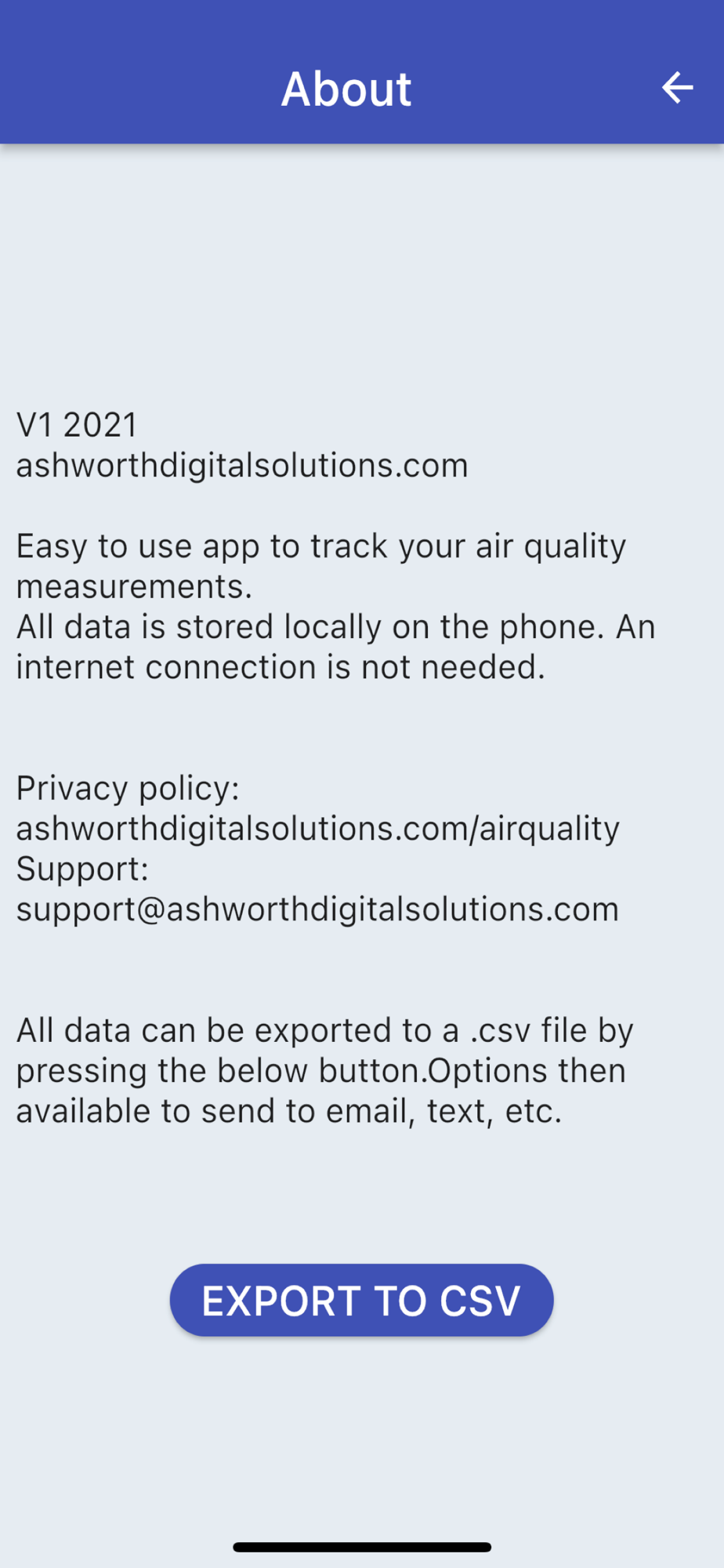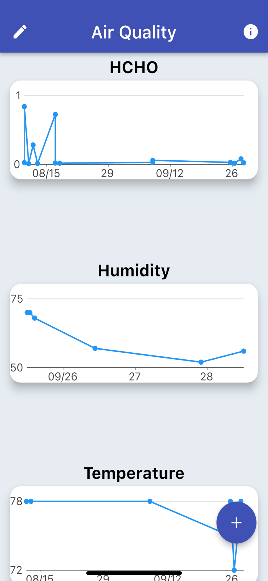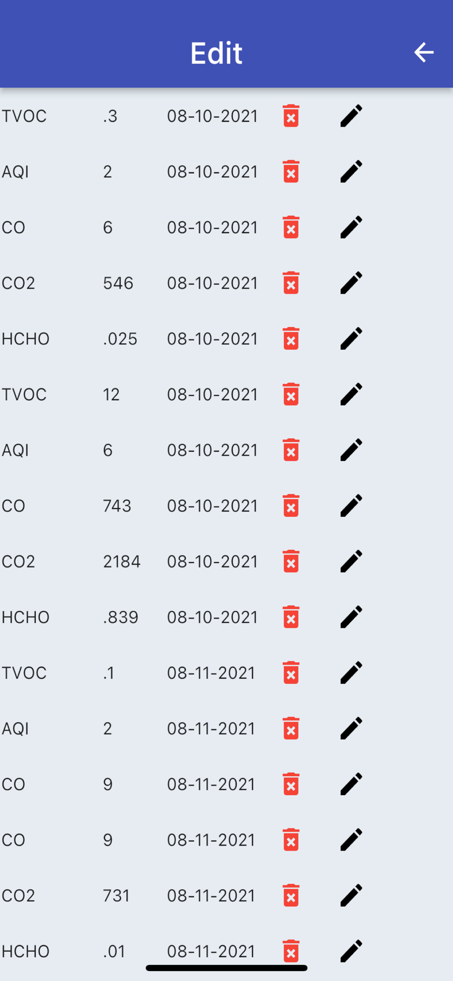 An easy to use app to log air quality measurements from home or industrial monitoring devices. Simple to use data entry screen. View the data in easy to read, automatically generated graphs. Edit or delete any existing test results. Air quality test results / parameters tracked include: