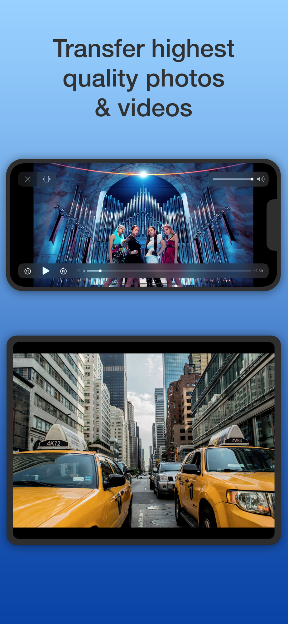 • Your files, documents, music, photos and videos are transferred directly from device to device using your local WiFi network. They are not stored in an external server and they never leave your local WiFi network keeping your photos safe.