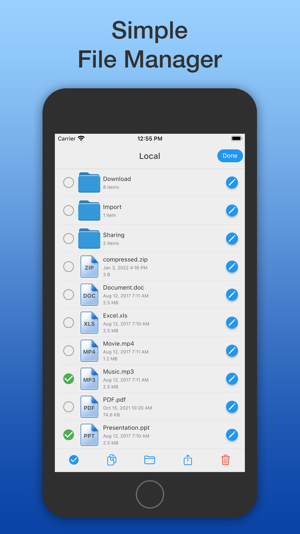 File Sync is the fastest and easiest way of transferring your files, documents, music, photos and videos to computer using the most advanced technology. It can also convert HEIC photos to JPG, HEVC videos to MP4 and Live Photos to videos. With latest update File Sync now can store documents, audio or music files into the app and you can then view, play music, manage and share files to others.