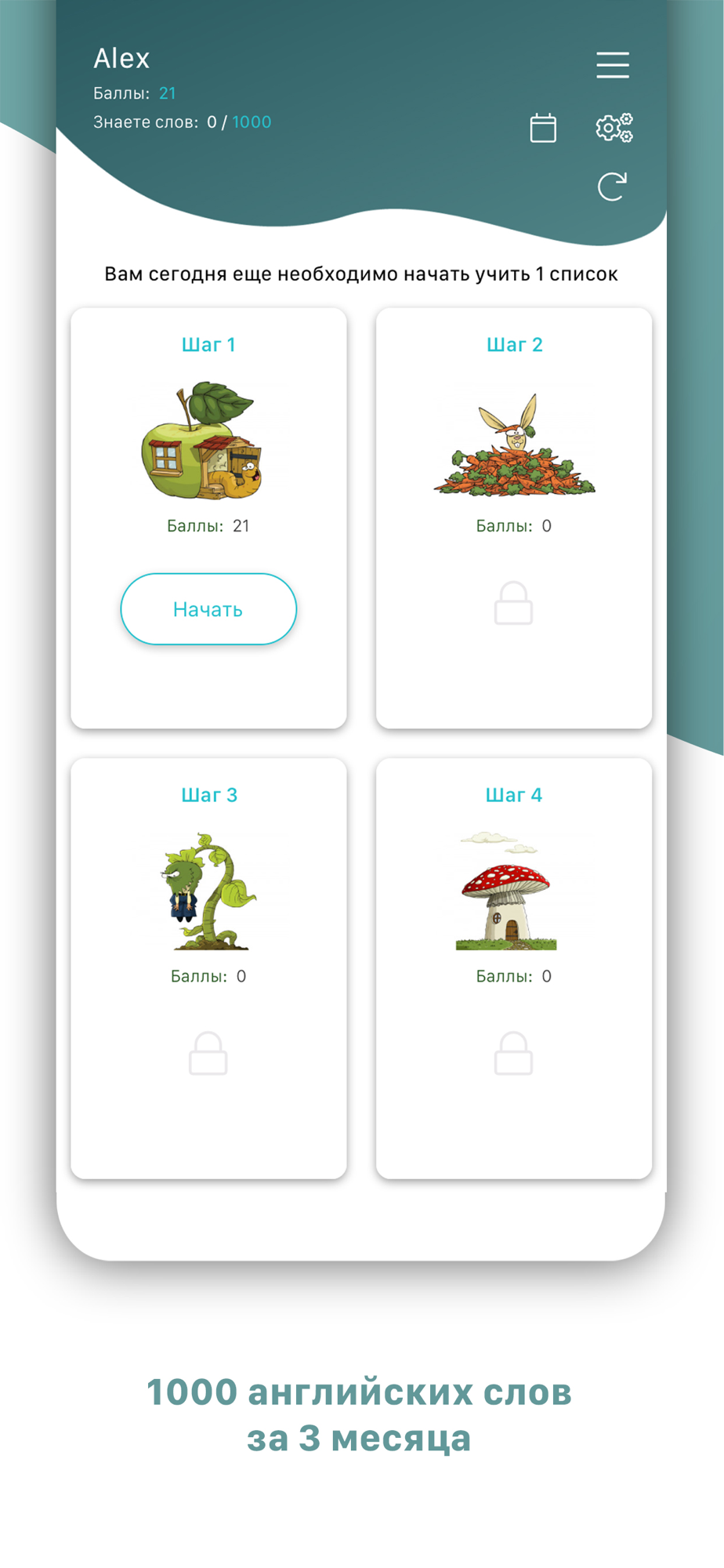 Each list of the course (20 English words) must be repeated on 3 or more exercises and test, on certain 6 days within 3 months. All that is required of you is to start learning new lists according to your plan, and then the application will remind you when it’s time to repeat them.