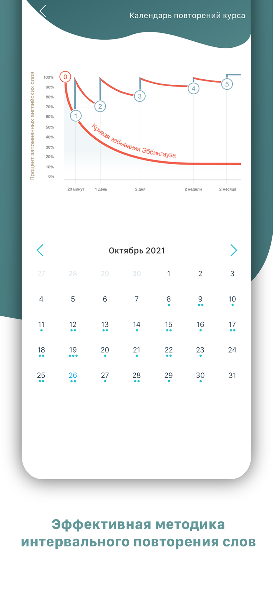 The application uses a built-in spaced repetition calendar based on the H.Ebbinghaus Forgetting Curve. This technique ensures the maximum efficiency of memorizing English words and guarantees a stable increase in the vocabulary of the English language.