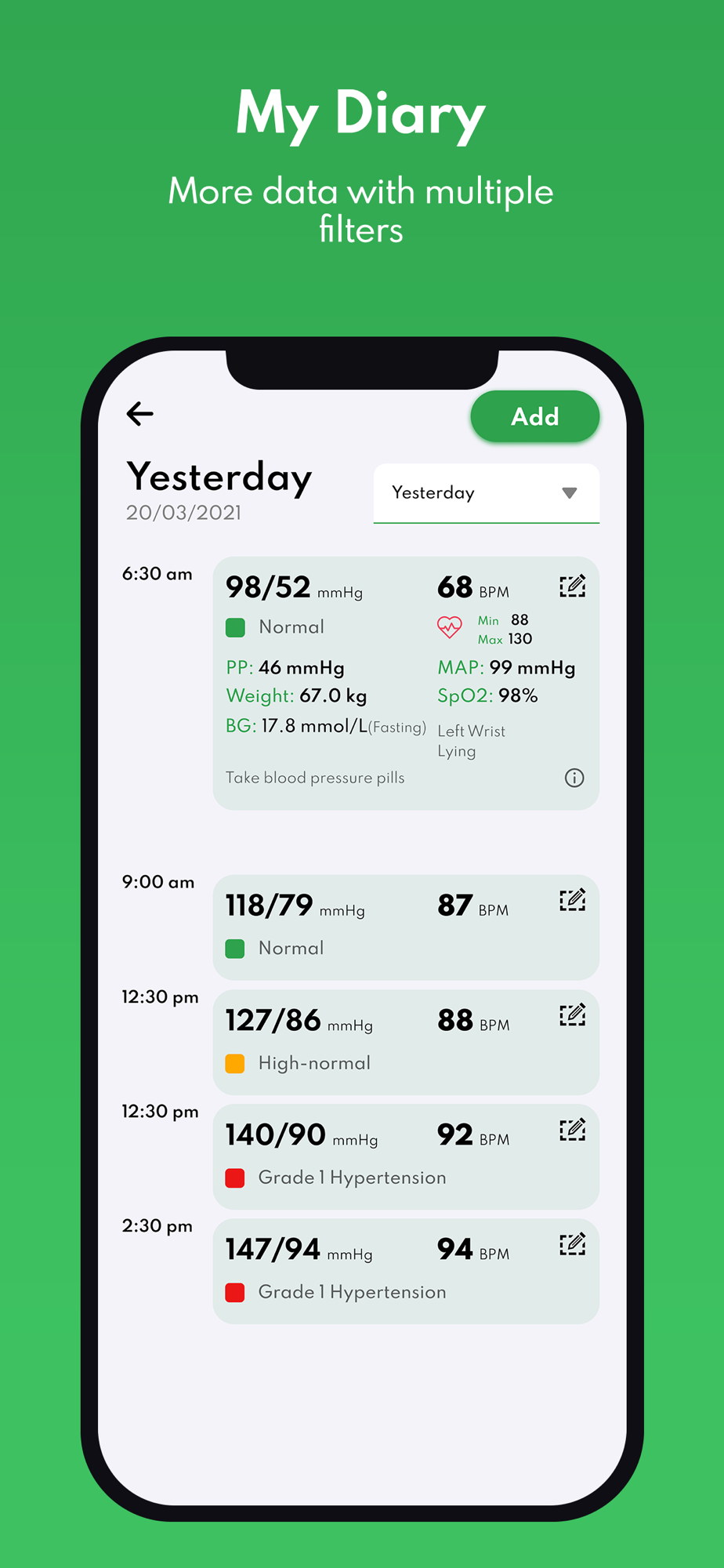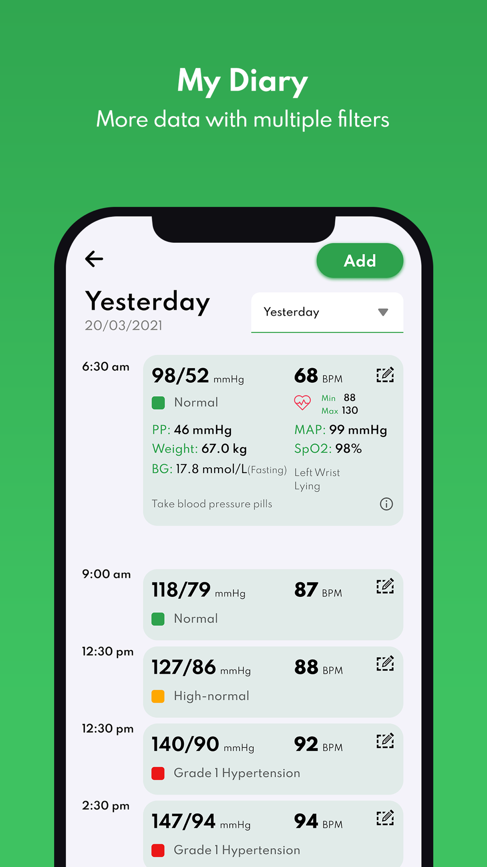It gives you a better understanding of your Blood Pressure, Blood Sugar & Heart Rate. Helps to foresee any future problems that may arise. You can see if your daily record are fluctuating or maintaining similar pattern of Blood Pressure, Blood Sugar & Heart Rate.