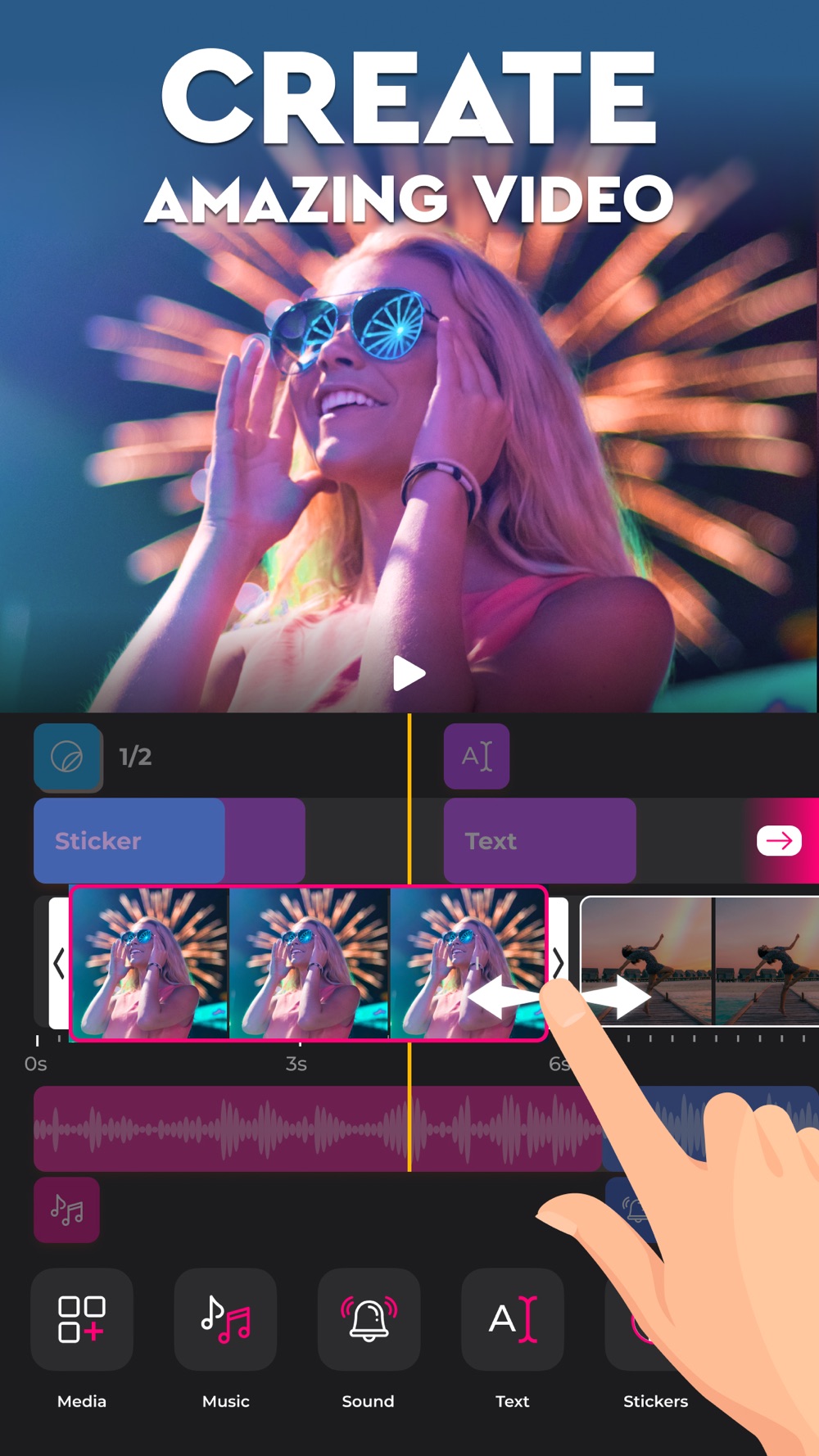 Clipy is powerful video editor! Create beautiful video clips in minutes! Select photos and videos, add transitions and music. Decorate your clip with stickers and colored fonts.