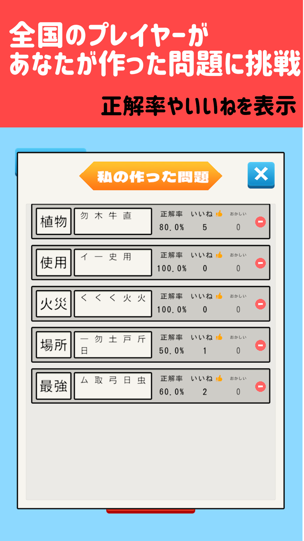 また、自分でオリジナル問題を考え、全国のプレイヤーに出題も可能。