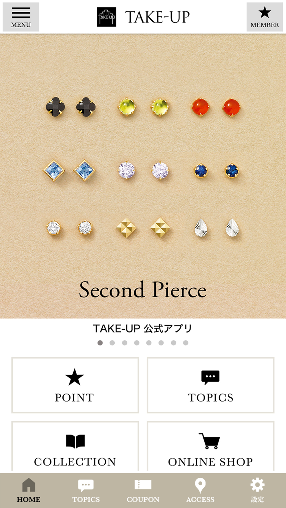 ジュエリーブランド【TAKE-UP-テイクアップ-】の公式アプリでは、お得なキャンペーンや新作情報をお届けするほか、店舗でのスタンプカードやWEBショッピングにご使用できます。