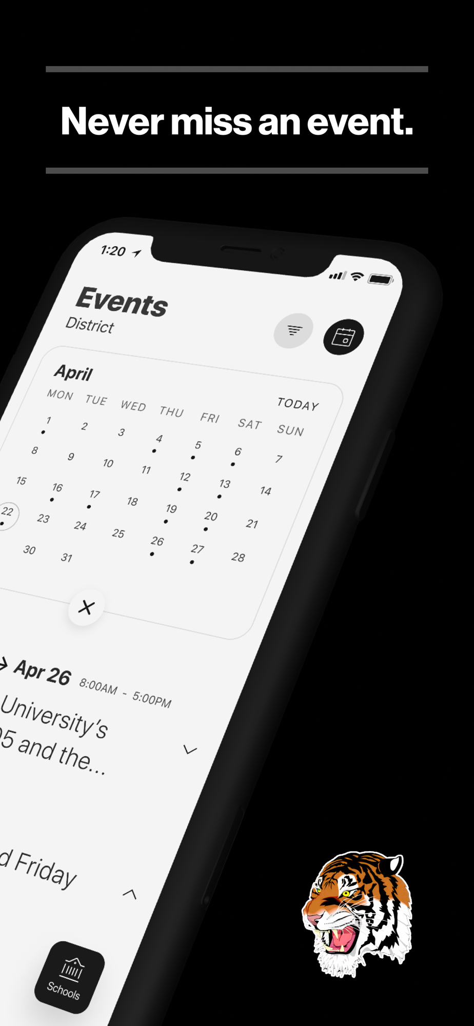 The event section shows a list of events throughout the district. Users can add an event to their calendar to share the event with friends and family with one tap.
