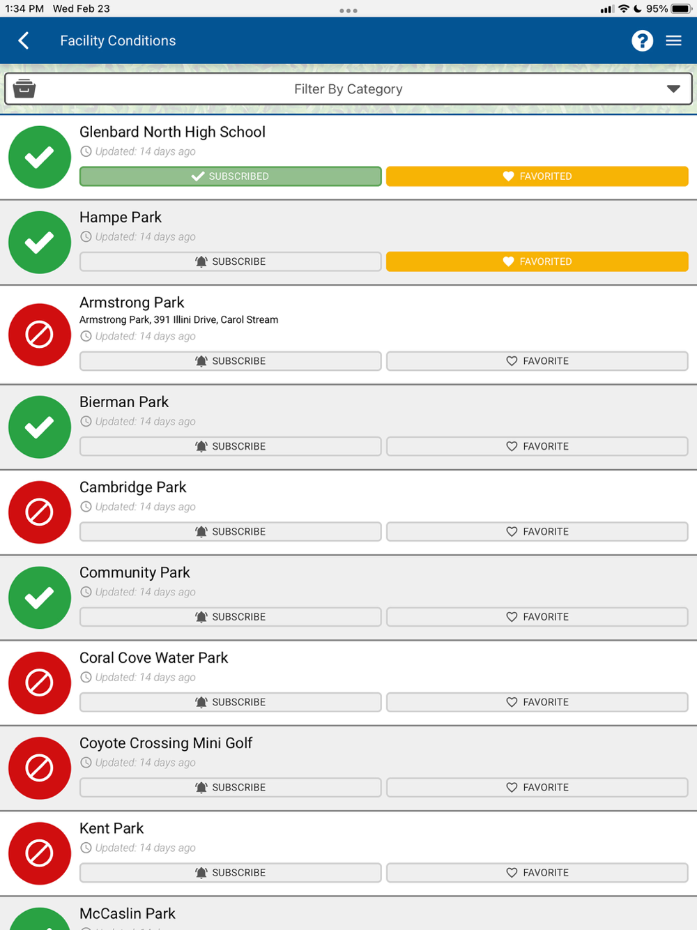 Included in the app is an interactive map of parks, allowing you to sort by amenity (child swings, soccer fields, restrooms, shelters, etc.) A Google map displays directions to the park.