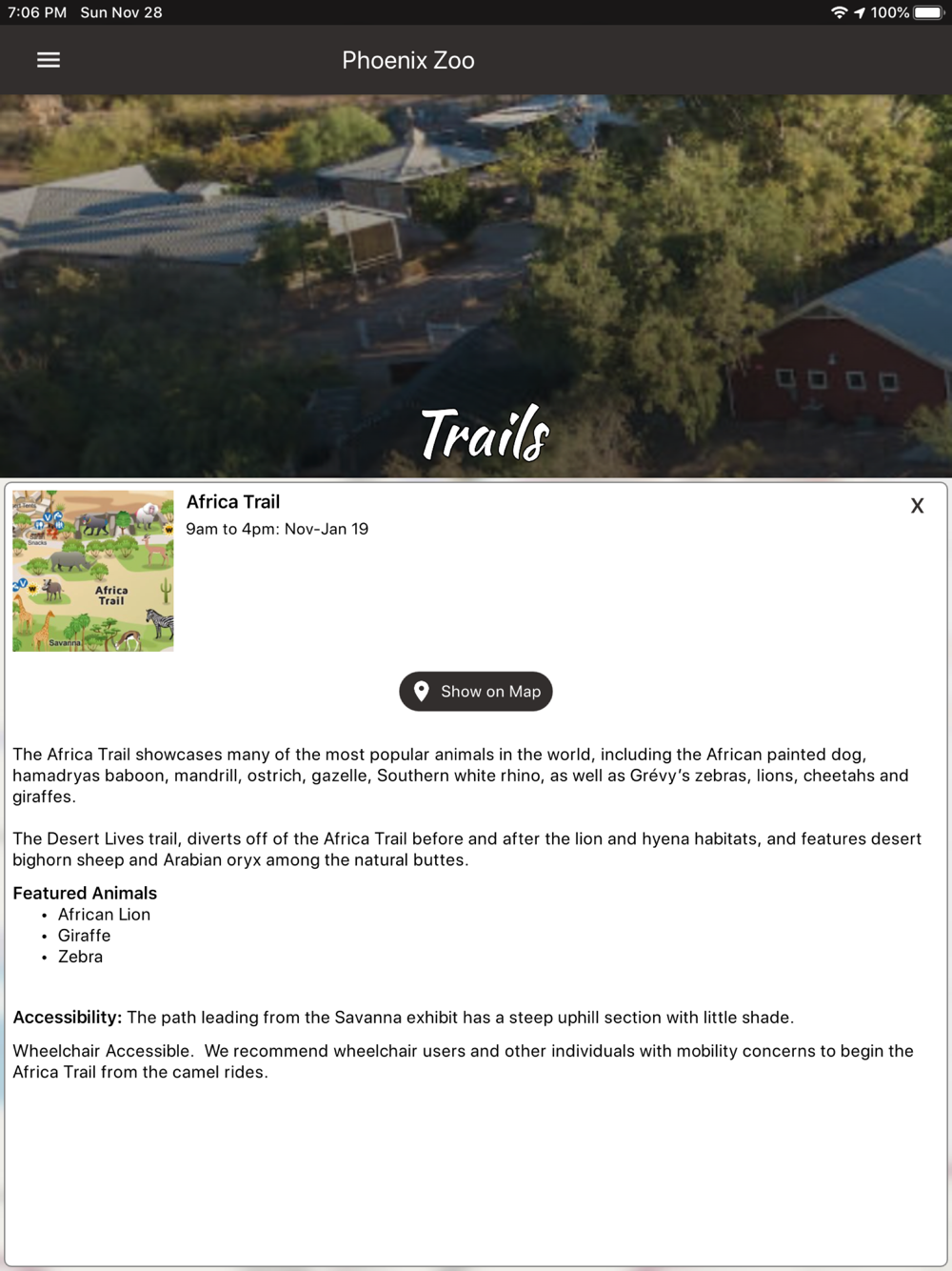This app is a must have companion when exploring the zoo. Toss away those printed maps nobody likes to use and maximize your fun by using this app to save you time and frustration! Easily see exactly where you are and where you want to go, using our GPS map and search engine that routes you to your destination: animals, restaurants, shows, ATM's, restrooms, and so much more...