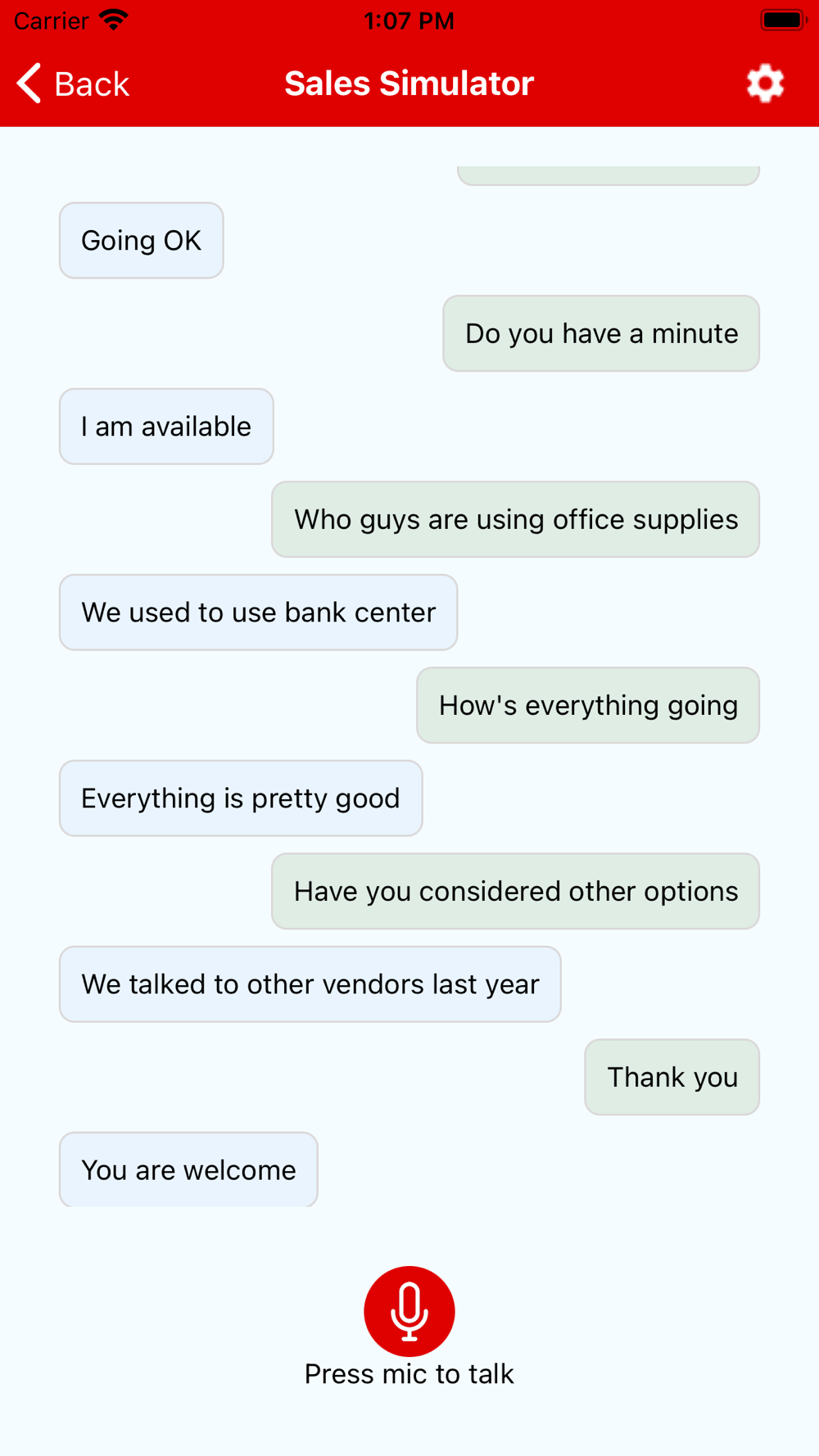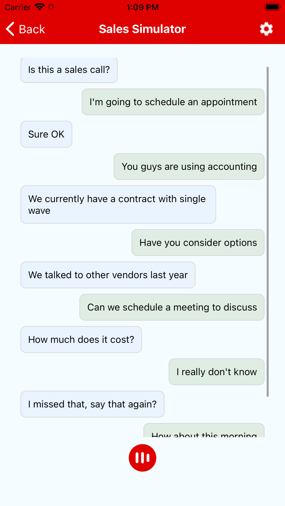Sales Simulator is a sales role-play app that allows sales professionals to role-play cold calls and objections. Through the app, the salesperson will be able to talk to an AI bot that is designed to play the roles of prospect and gatekeeper. EULA : https://salesscripter.com/terms-of-services/