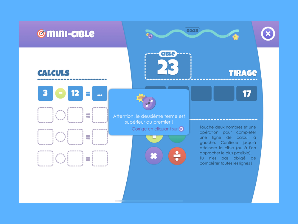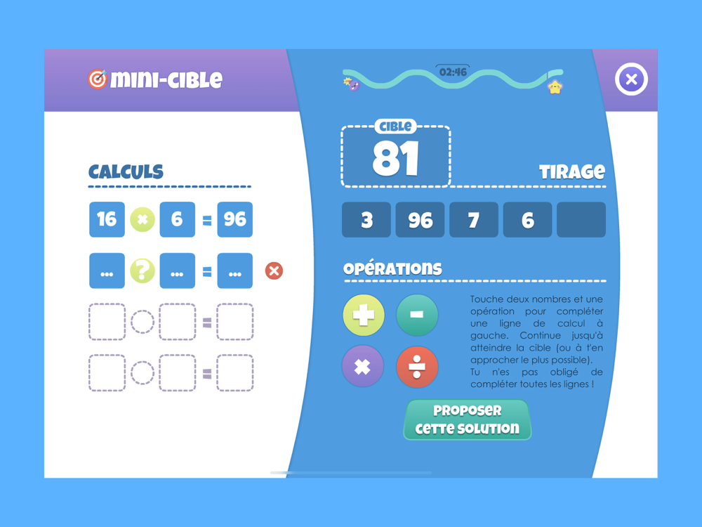 Dans ce mode, les calculs sont effectués automatiquement par l’application, dès lors que le joueur a choisi deux nombres et une opération.