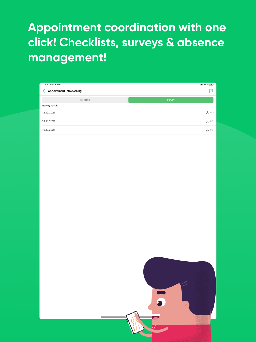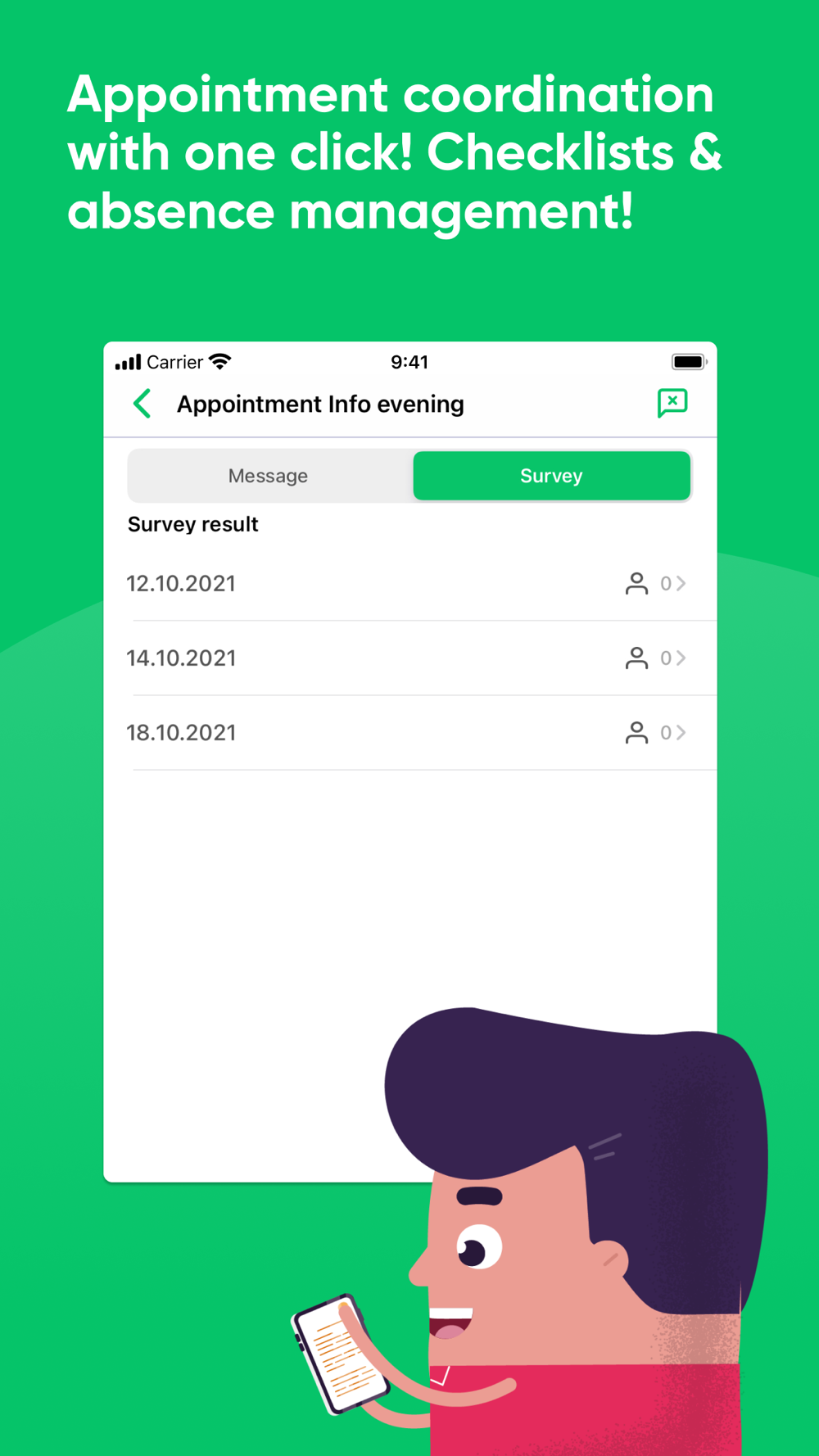- Plan & organize with checklists, surveys, absence management & appointment coordination