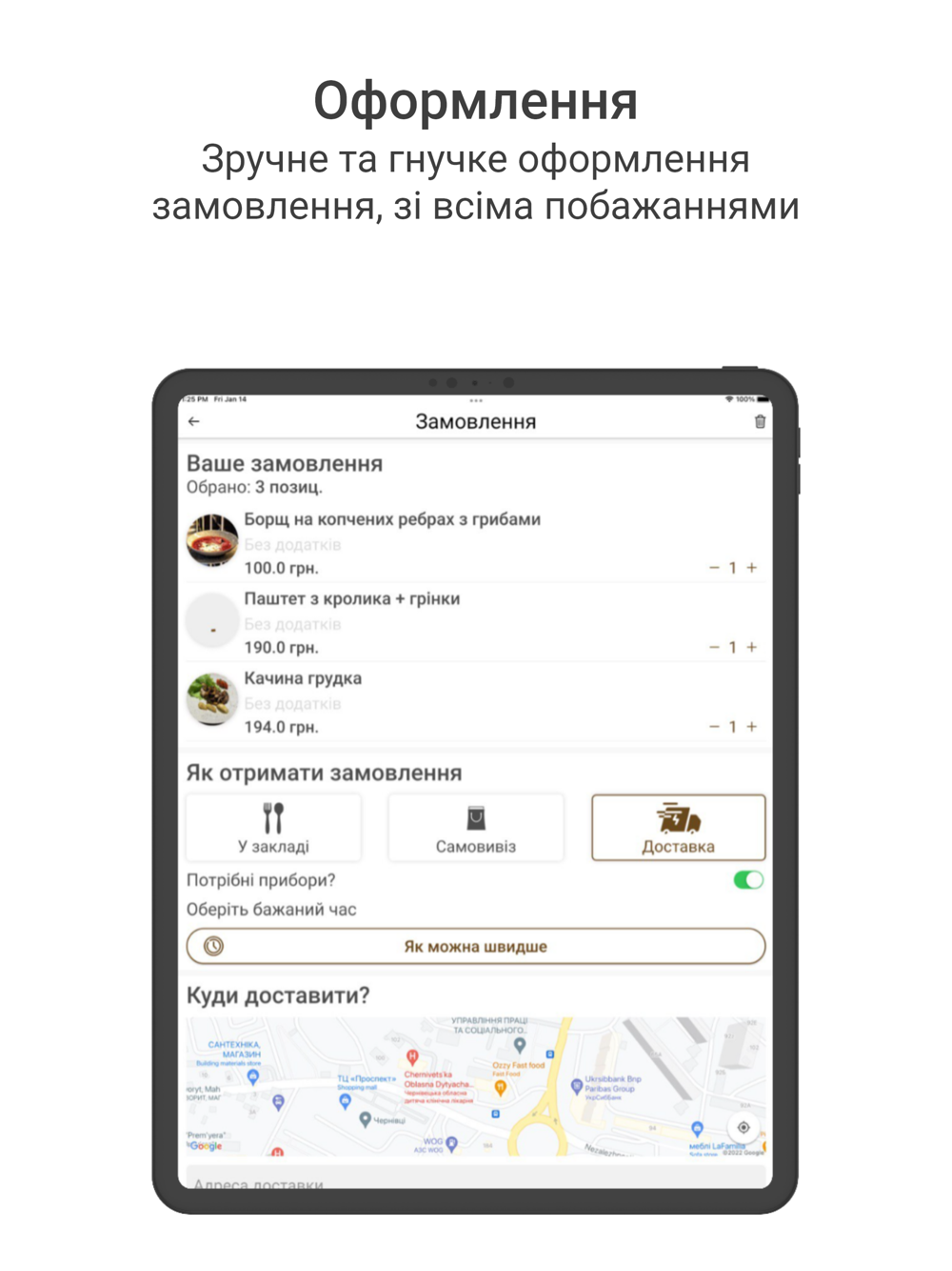 Мобільний додаток Kucheri дозволяє Вам робити замовлення Ваших улюблених страв, як на доставку, так і в закладі. Меню завжди у Вашому телефоні.