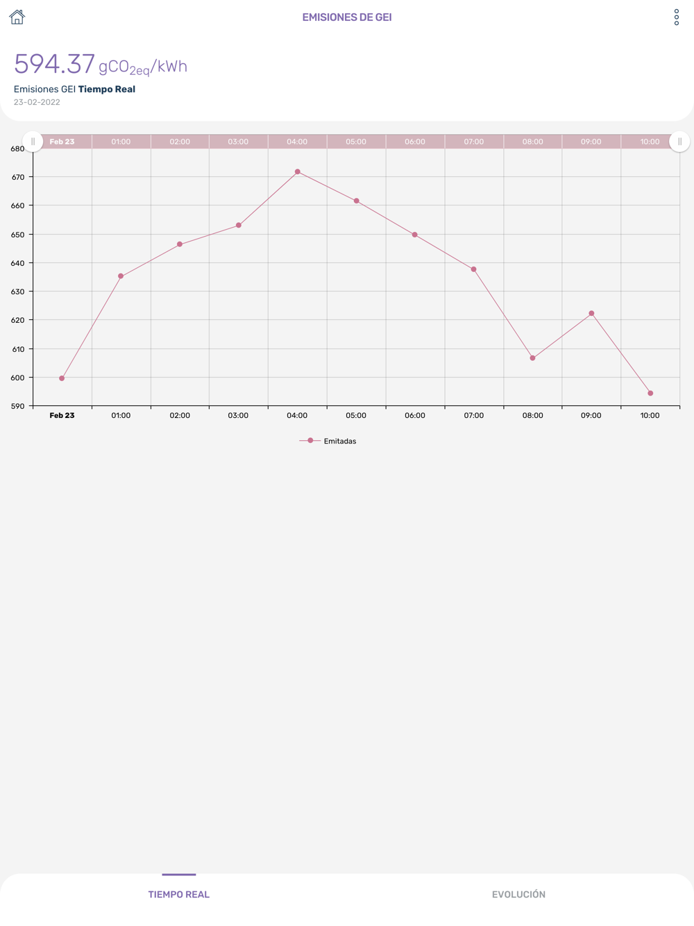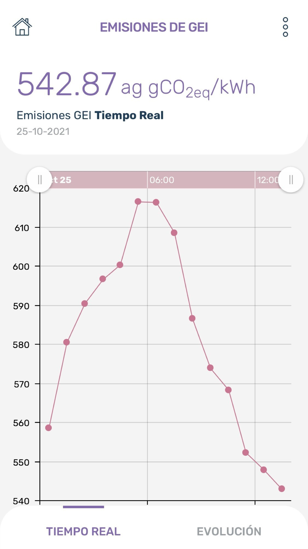 Adicionalmente, la aplicación te proporciona en tiempo real una estimación de las emisiones de gases efecto invernadero del sistema eléctrico. Los valores se presentan para períodos horarios y te permiten conocer las horas en que la energía generada es más limpia.