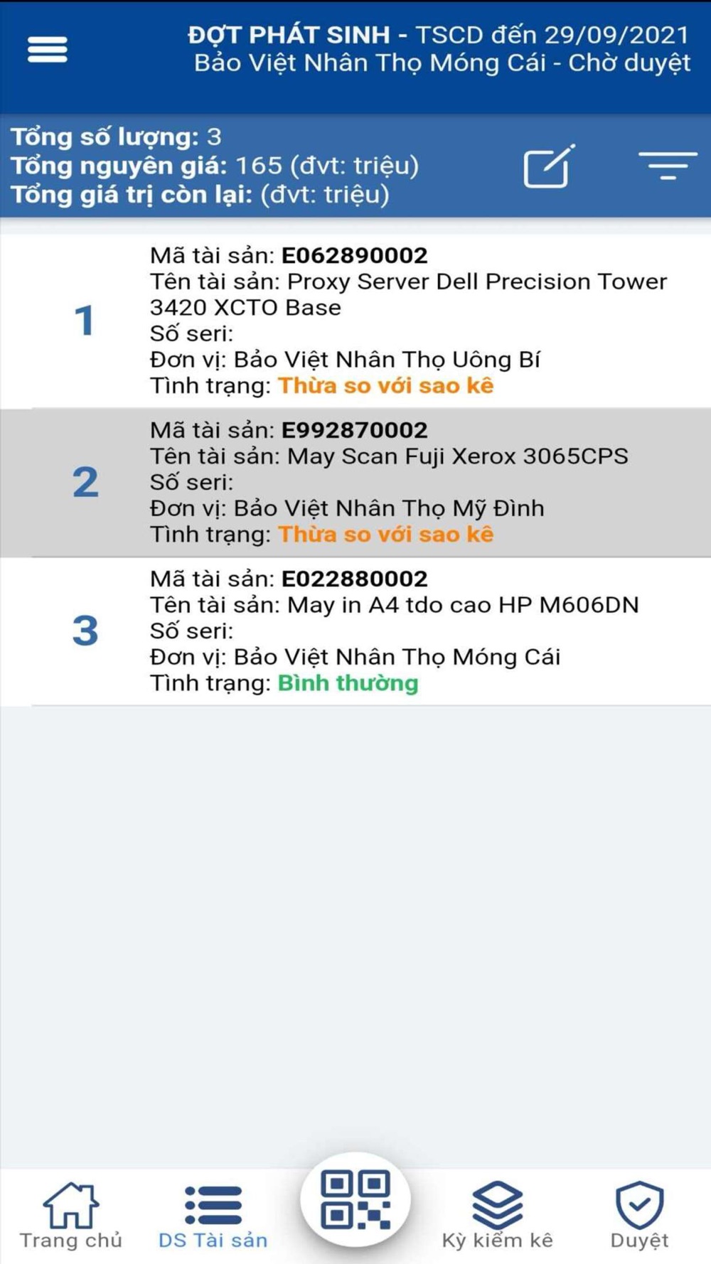 - Kiểm tra các tài sản trùng, thừa so với danh mục cần kiểm kê để kiểm tra thông tin trước khi duyệt Danh mục kiểm kê các nội dung cập nhật thông tin.