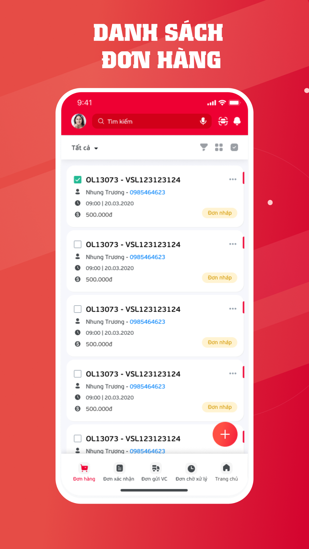 Ứng dụng cho phép gửi vận chuyển nhiều đơn hàng với 1 lần chạm. Các đơn hàng được đồng bộ từ nhiều kênh bán: Facebook, website,...Trạng thái đơn hàng được cập nhật liên tục theo thời gian thực.