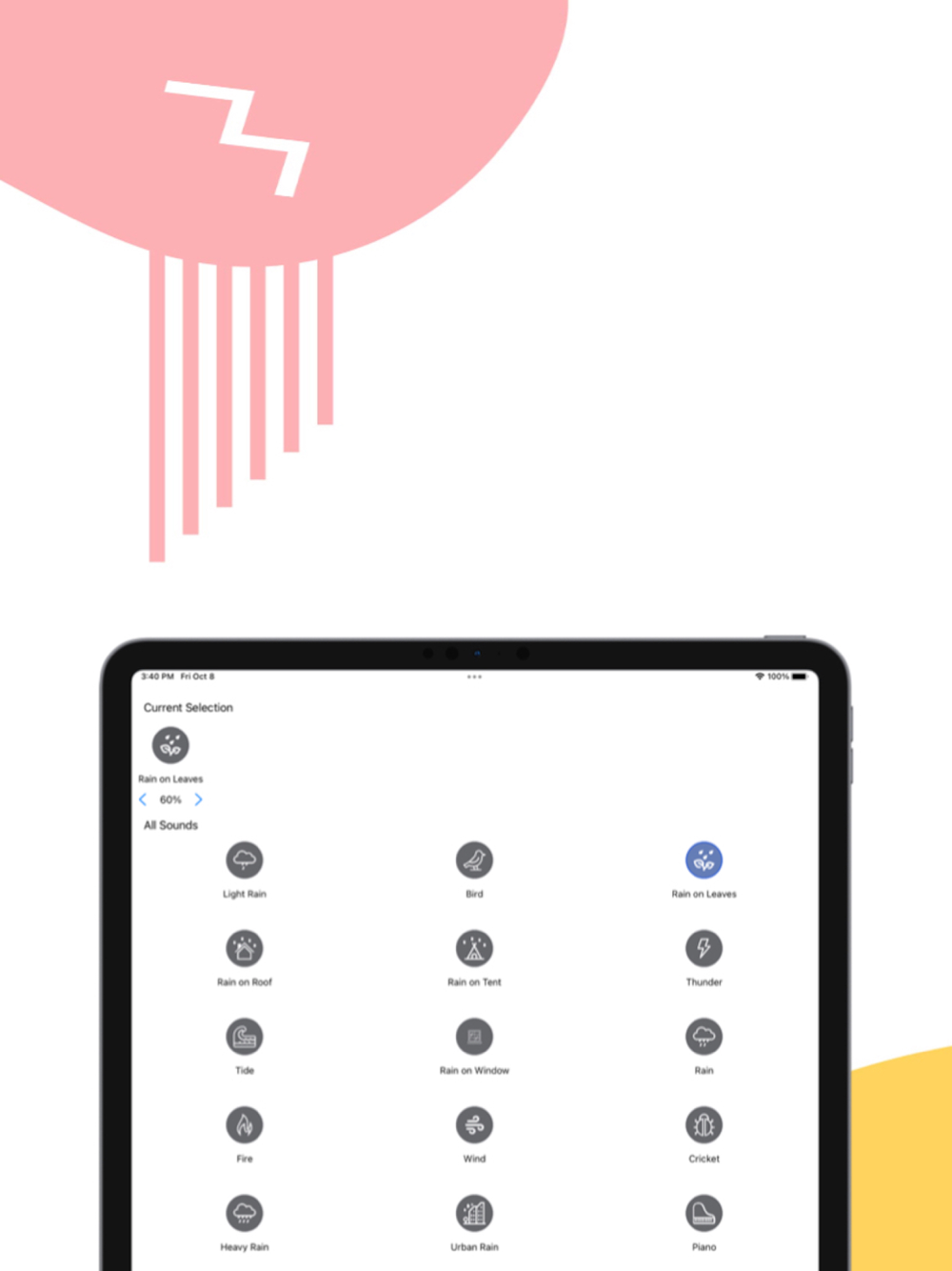 This Rain Sleep noise app is highly customizable and easy to use. You'll have everything in front of you. You can increase or decrease the volume of different sounds very easily, and add or remove different kinds of sounds to your rain sleep sounds combination.
