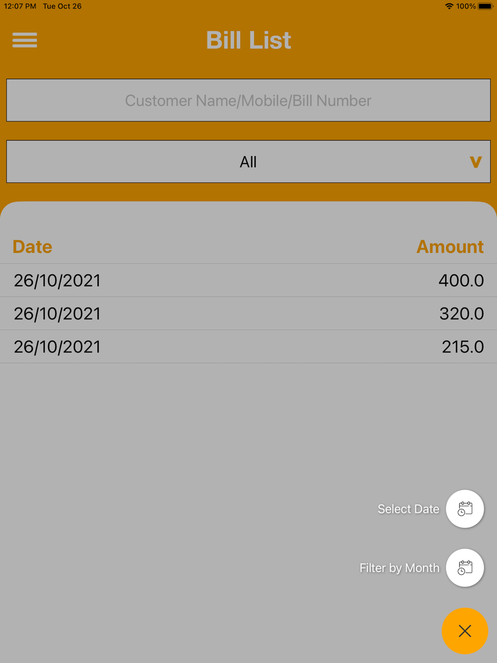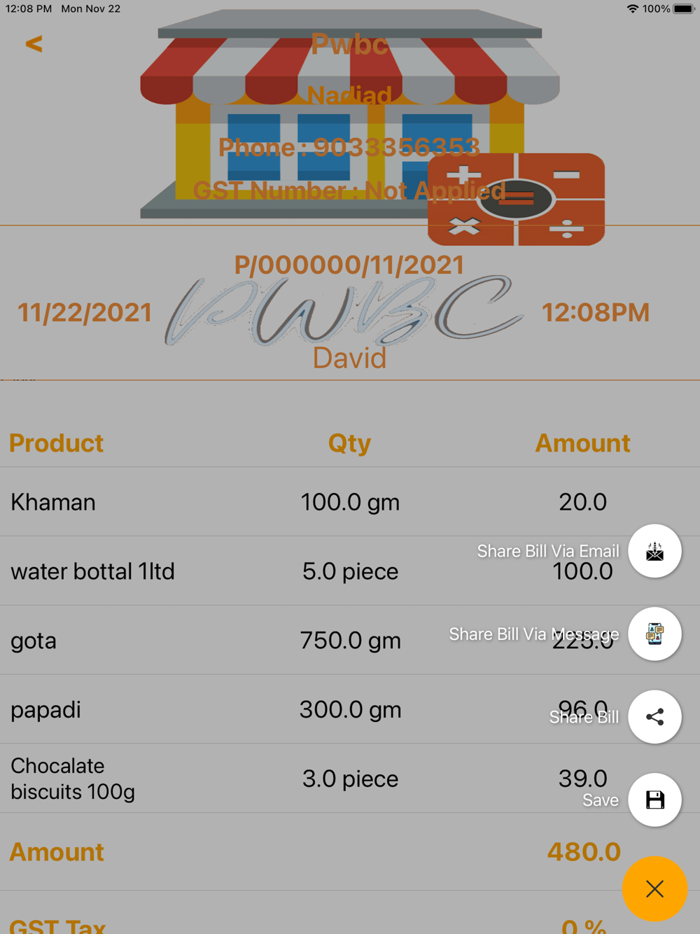 5.Search the bill base on the date or bill number and also you can share the bill using sms ,email or other sharing Activity.
