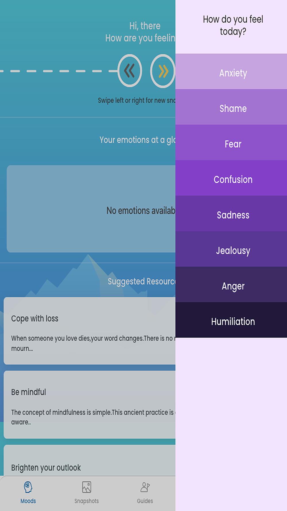 The Moodmaps Emotion Tracker helps you become aware of when and how various emotions are triggered. You can save snapshots of your emotions that capture the time and place. In addition, you can add a photo and a note for more details.