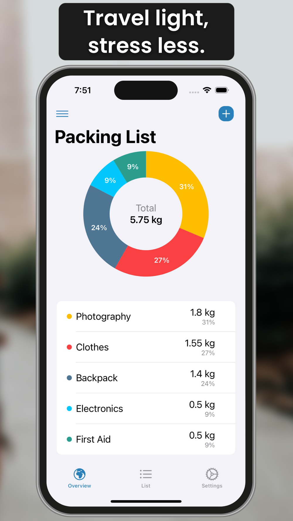 A weight focus Light Packing List mobile app is a tool that helps users create and manage their packing lists for trips with a focus on keeping the weight of their luggage to a minimum. The app allows users to easily add and remove items from their list, and keeps track of the weight of items that have been packed. Light Packing List App also includes a chart that visually displays the weight of packed items. The app also has a feature that suggests lightweight items to pack based on the user's destination and length of trip. With a clean and intuitive interface, the app makes it easy for users to ensure they don't forget any essential items and avoid overpacking. Added support for iCloud, making it easier for you to access your lists across multiple devices. Upgrade to the premium version for ad-free experience and support the developer.