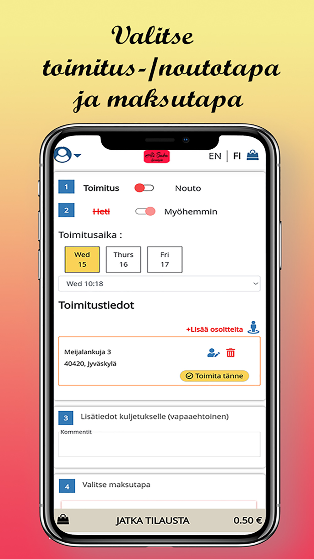 Sovelluksessa sinulla on mahdollisuus valita erilaiset maksutavat. Meillä on käytössä: