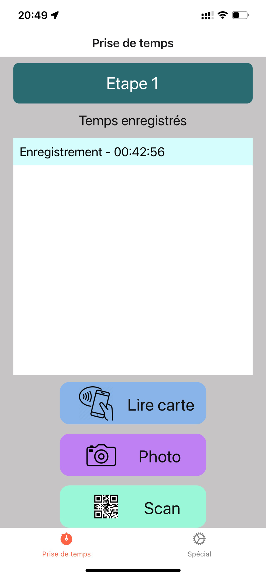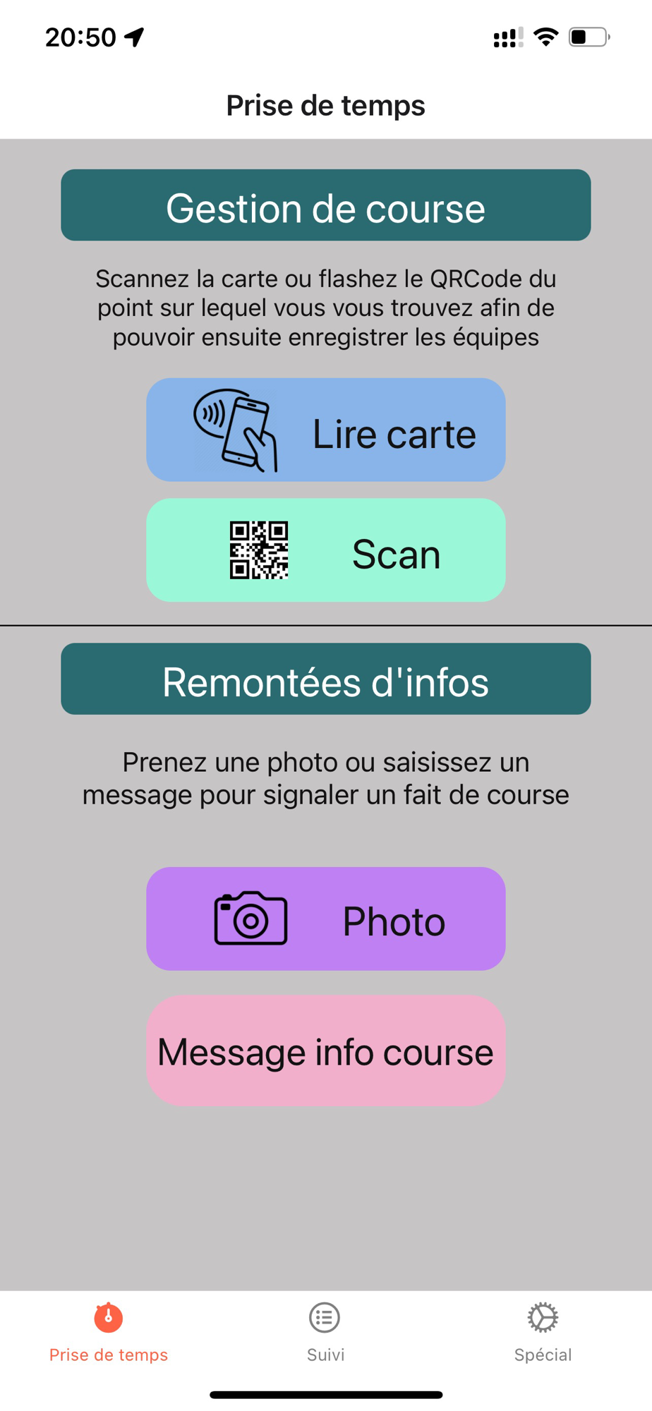 Cette application, basée sur la lecture de codes barre et de cartes NFC, vous permettra de récupérer simplement tous les temps de passage des équipes dans les courses que vous organisez.