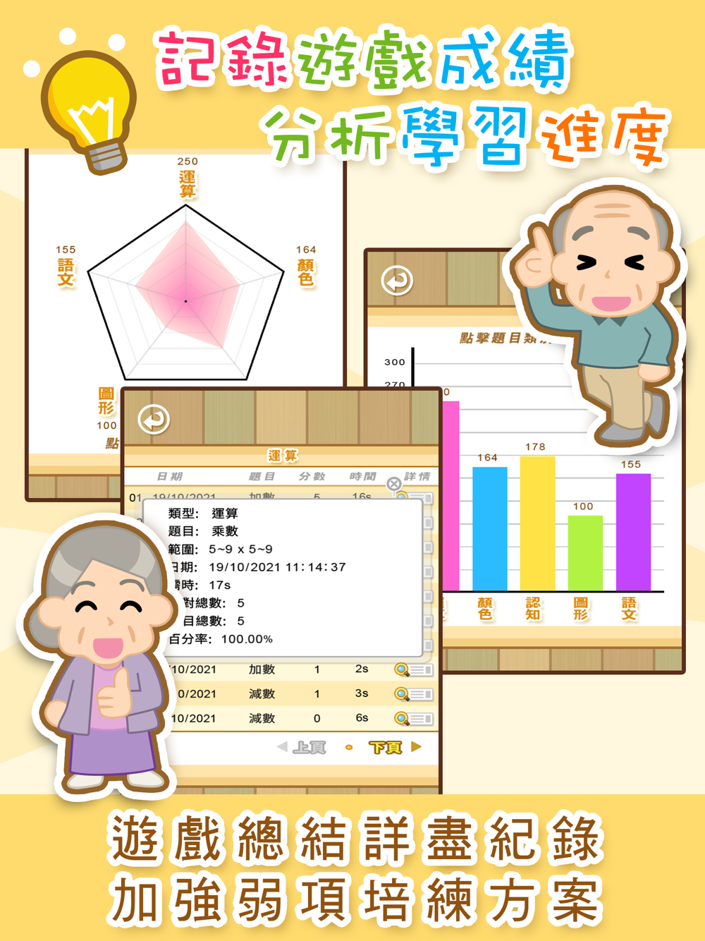 各個項目的成績均會詳盡紀錄,讓照顧者洞悉使用者的強弱項,藉此制定加強弱項的訓練方案。