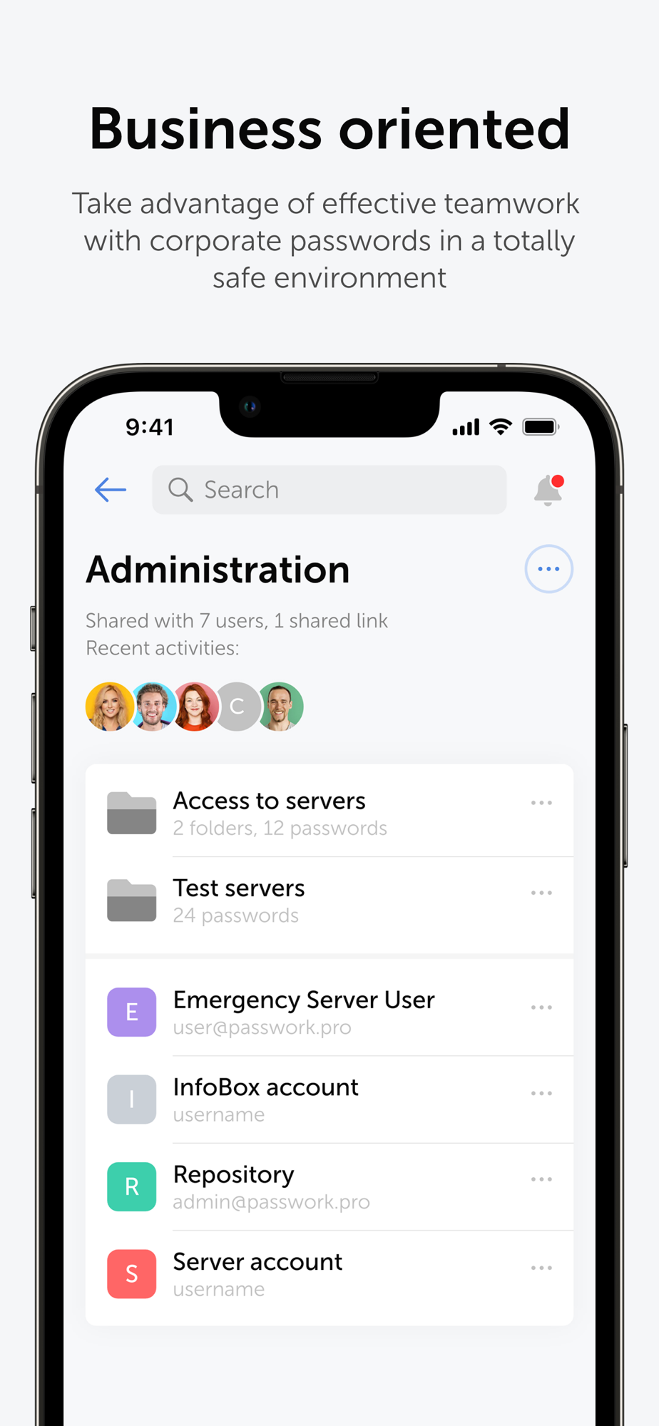 Passwork provides an advantage of effective teamwork with corporate passwords in a totally safe environment. Employees can quickly access all their passwords, while the rights and actions are closely supervised and managed by local system administrators.