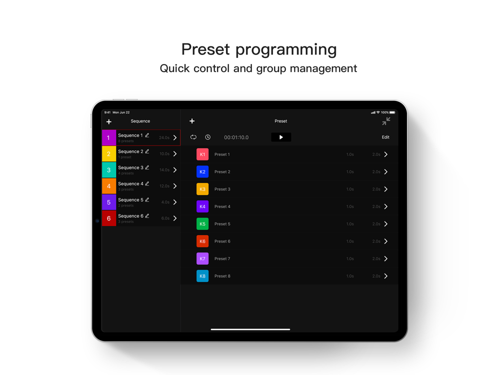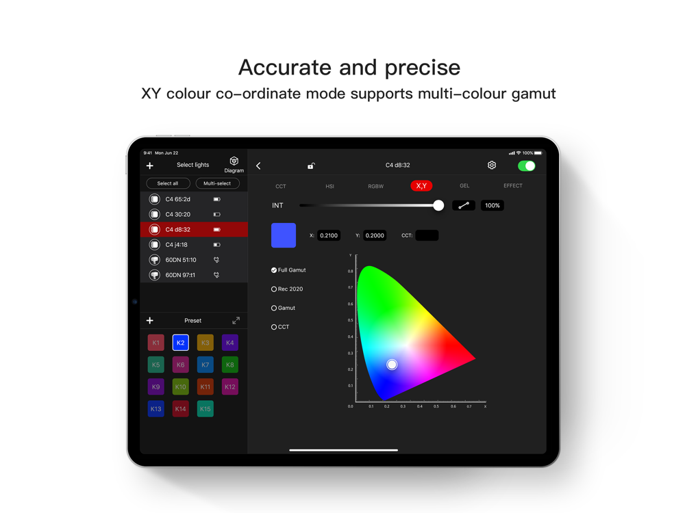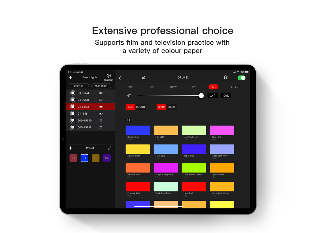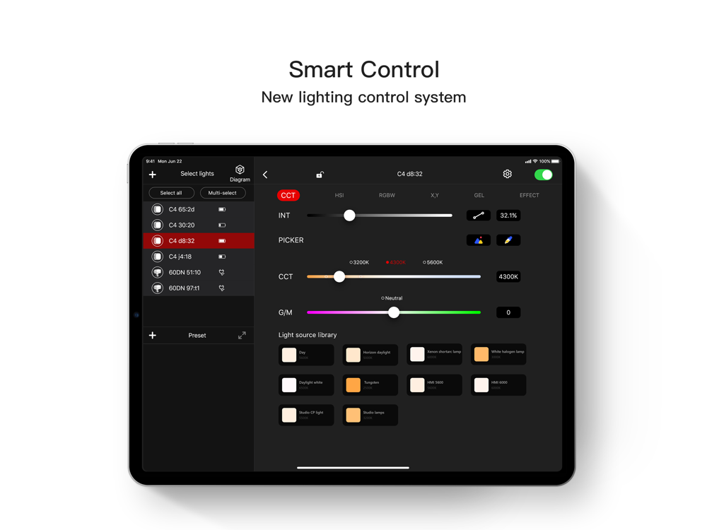 The iFootage Lumin App connects to mobile devices and controls individual and multiple sets of iFootage lights. The App provides complete control and storage of multiple professional lighting sets, applications and functions and supports colour temperature CCT, HSI, RGBW, XY colour co-ordinates, GEL colour paper, special effects, music and lighting pre-set functions. The Lumin App provides a simple and convenient professional support to photographers and videographers helping them to create and control lighting arrangements for a variety of scenarios and situations.
