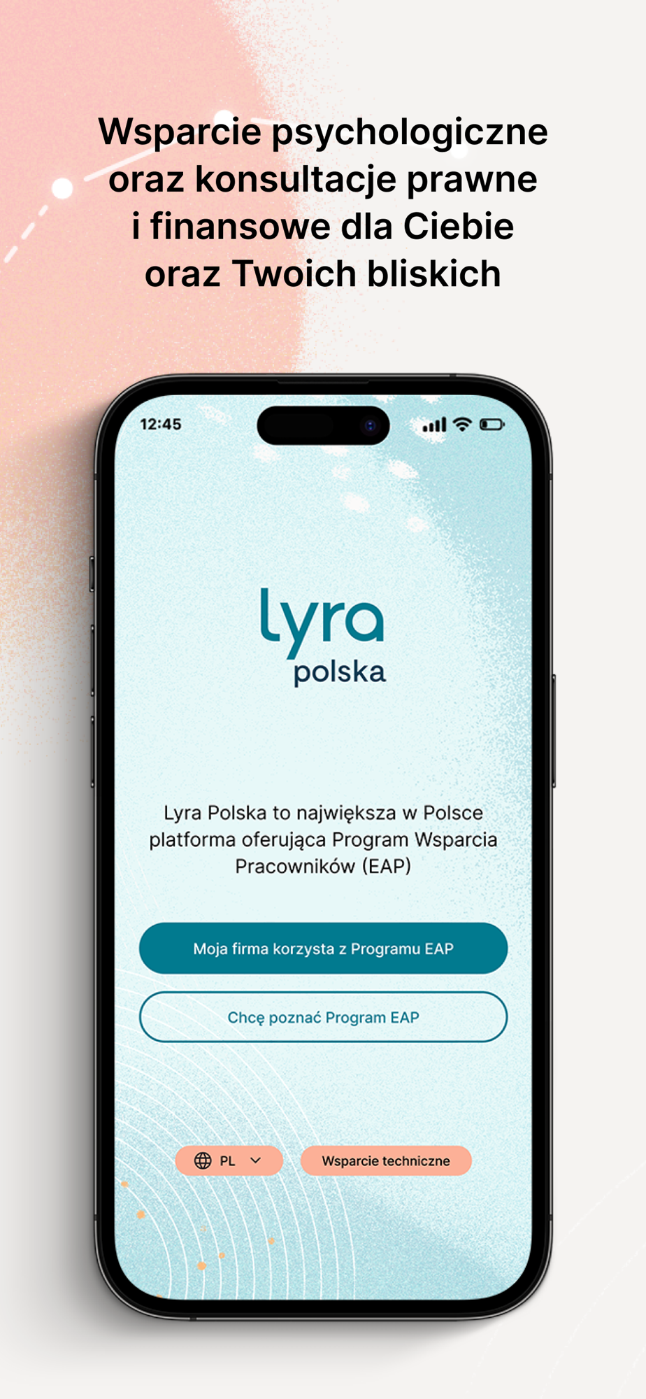 Aplikacja dla uczestników Programu Wsparcia Pracowników (Employee Assistance Program – EAP) Lyra Polska. Jeśli pracownicy Twojej firmy są objęci Programem Lyra EAP, wszystkie niezbędne informacje otrzymasz od Działu HR. Po zalogowaniu do aplikacji, możesz skontaktować się z naszymi ekspertami przez telefon, czat lub formularz kontaktowy, sprawdzić kalendarz wydarzeń rozwojowych i przeczytać polecane przez nas artykuły. Jeśli wsparcie EAP jeszcze nie jest w Twojej firmie dostępne, zapraszamy do zapoznania się z naszą ofertą na stronie lyrapolska.pl. Program Wsparcia Pracowników to dostęp 24/7 do indywidualnych konsultacji psychologicznych, prawnych i finansowych, ciekawe propozycje edukacyjne i wiele więcej!