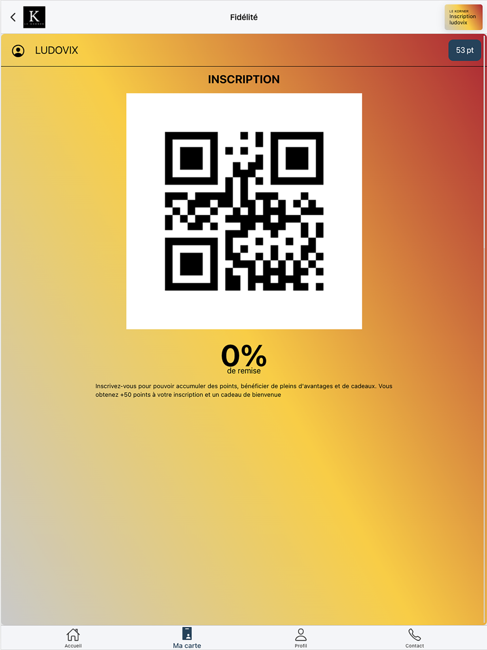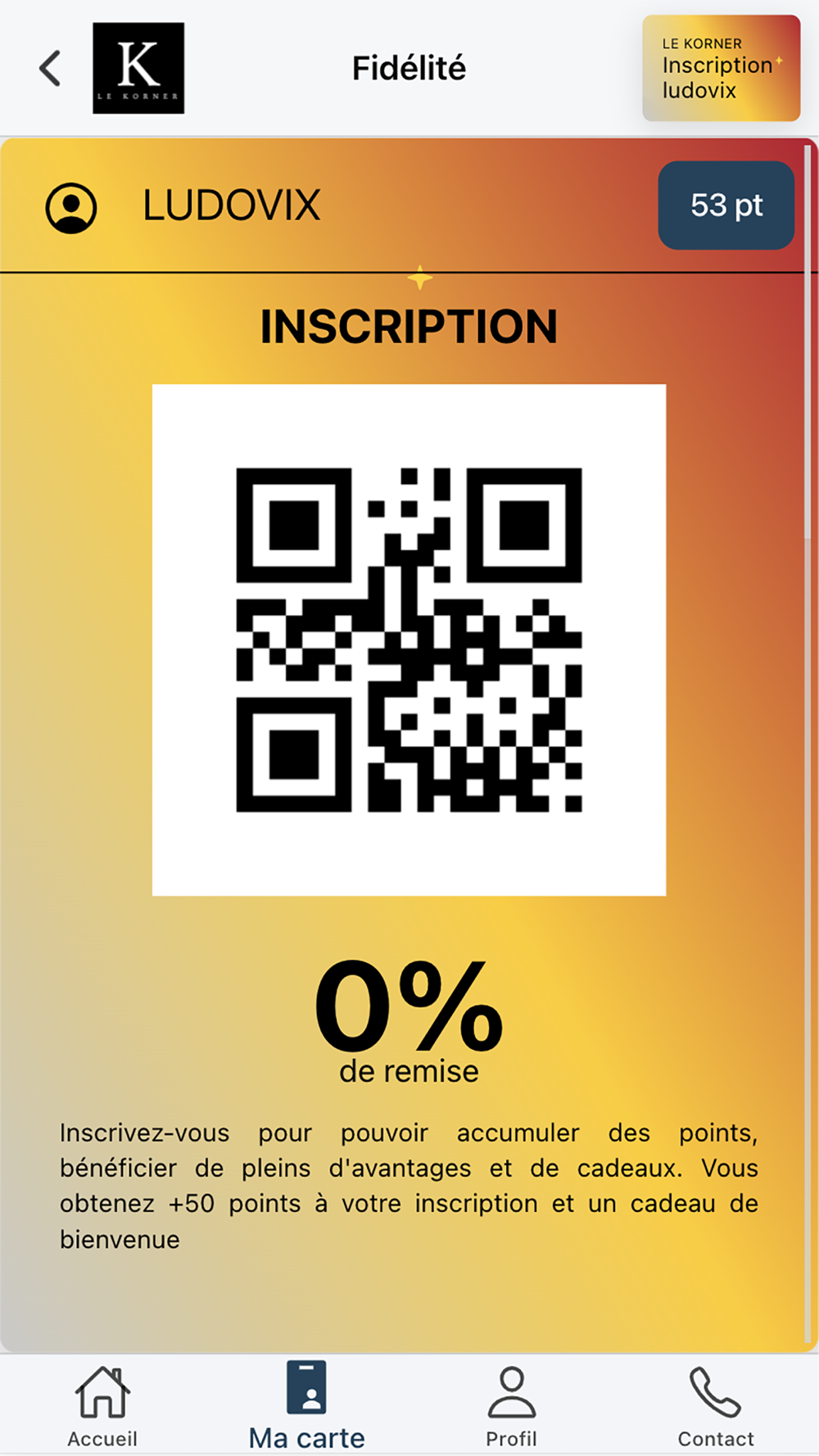 Dès l'inscription, le Korner vous offre 40 points fidélité (équivalent à 40 euros) + un cadeau de bienvenue et à chaque passage en caisse, le montant de votre ticket de caisse sera converti en point de fidélité sur présentation du QRCode de l'application. Le cumul de ces points vous donne droit à des cadeaux et des remises exceptionnelles.