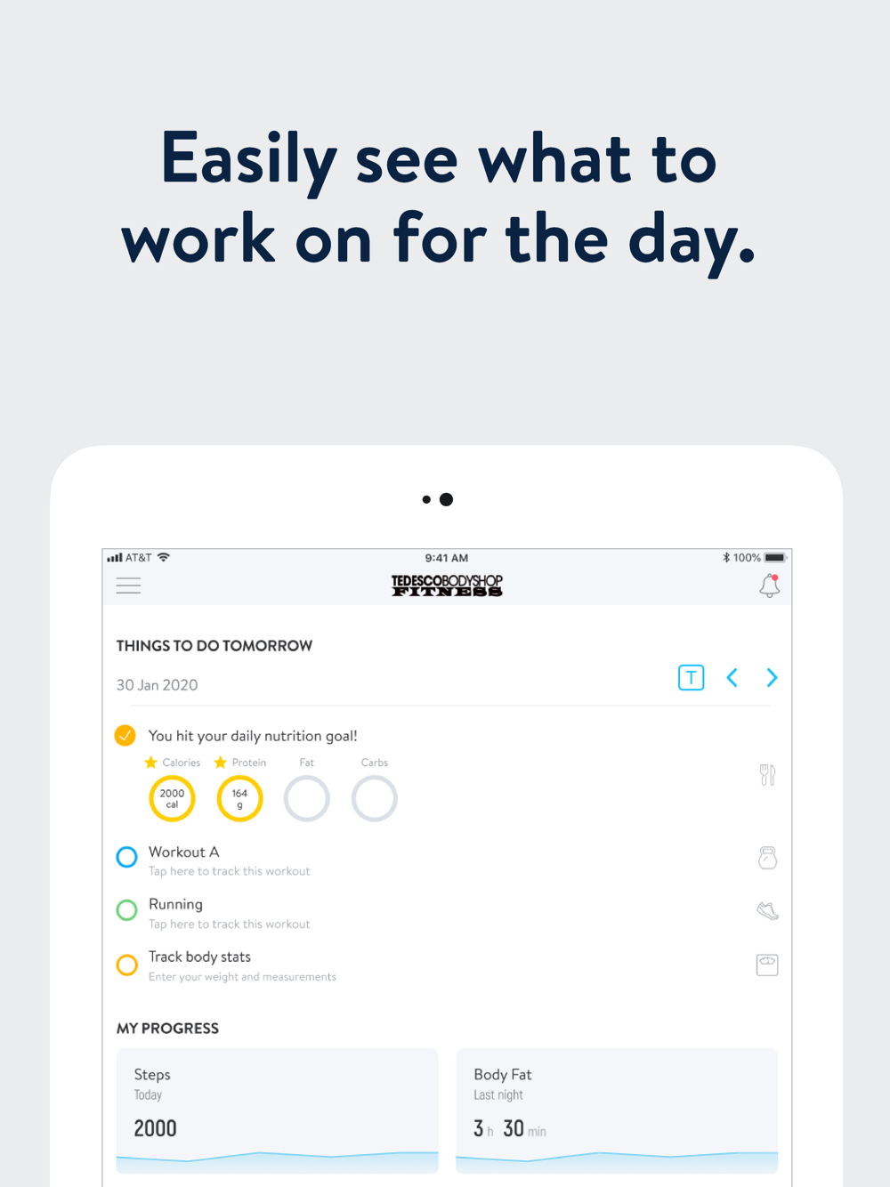 With the Tedesco Body Shop Fitness App, you can start tracking your workouts and meals, measuring results, and achieving your fitness goals, all with the help of your personal trainer.