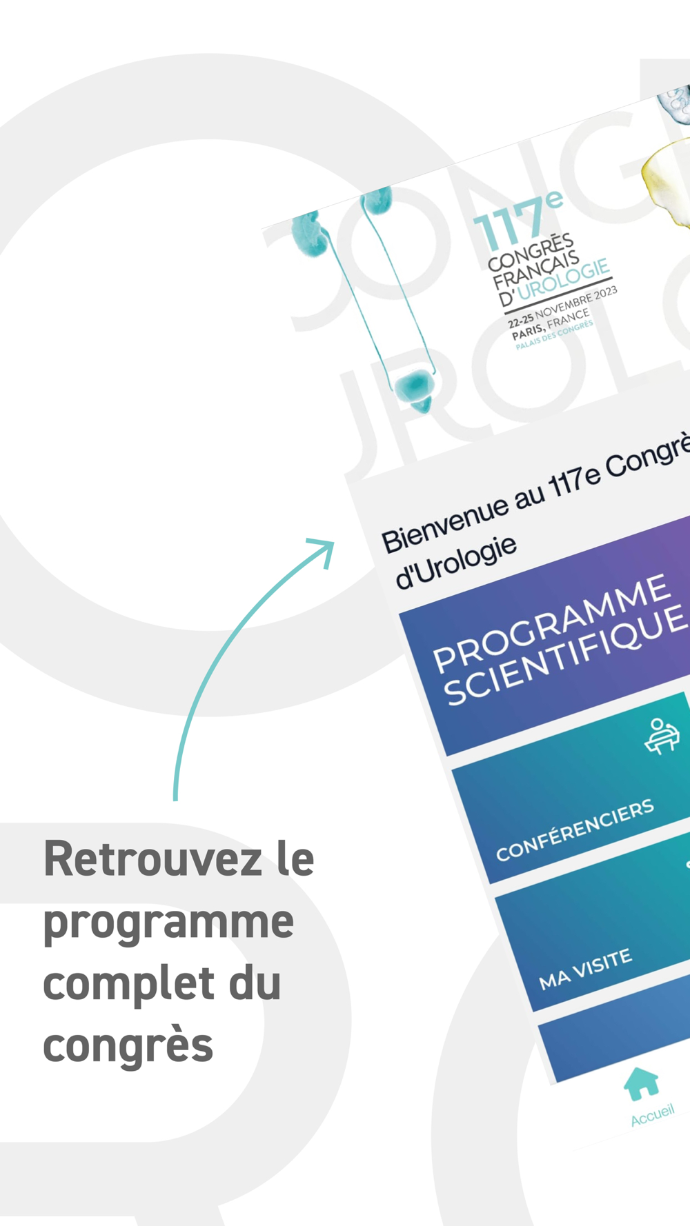 L'application officielle du congrès de l'AFU est l'outil qu'il vous faut pour organiser votre congrès et participer aux séances interactives ! Simple d'utilisation, ces nombreuses fonctionnalités vous permettront de consulter le programme scientifique mais aussi la liste des intervenants et des exposants ou encore le plan du congrès.