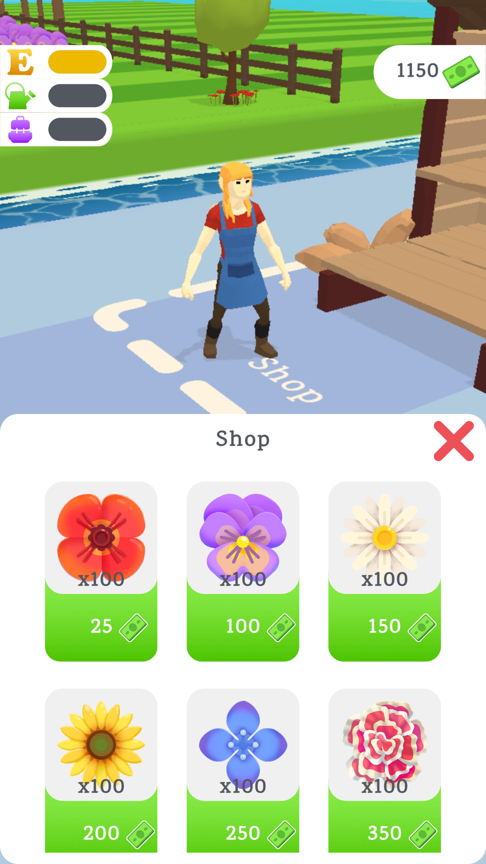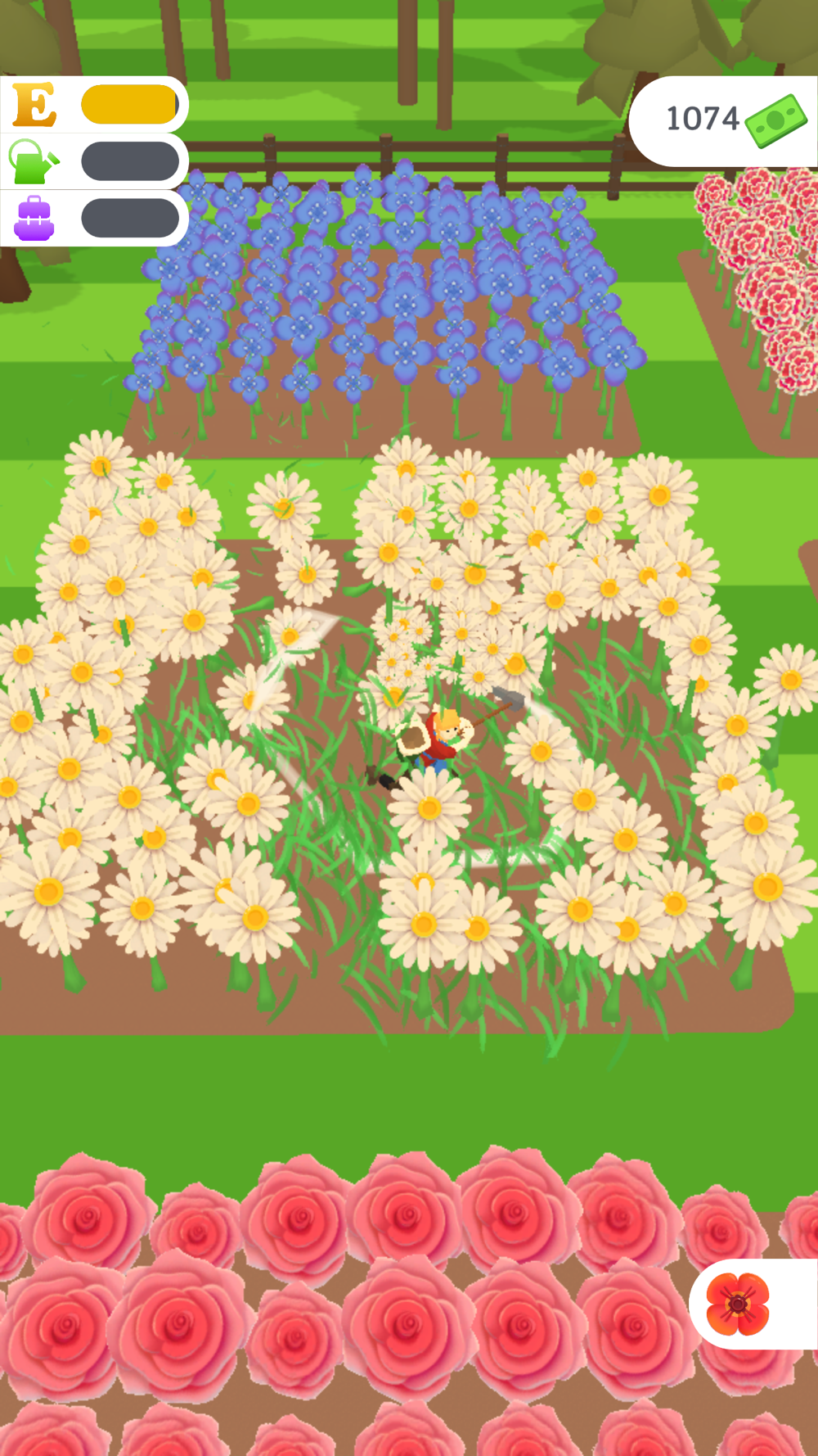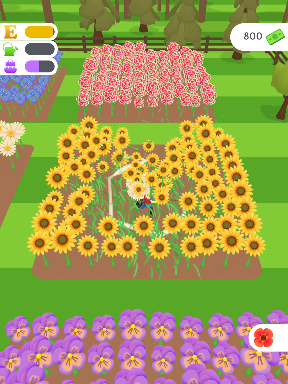 Explore the garden while planting, growing, watering, harvesting and selling flowers. Purchase and unlock new fields and flowers in order to grow your ranch and the variety of flowers. In order to plant and harvest quicker you can upgrade your abilities.