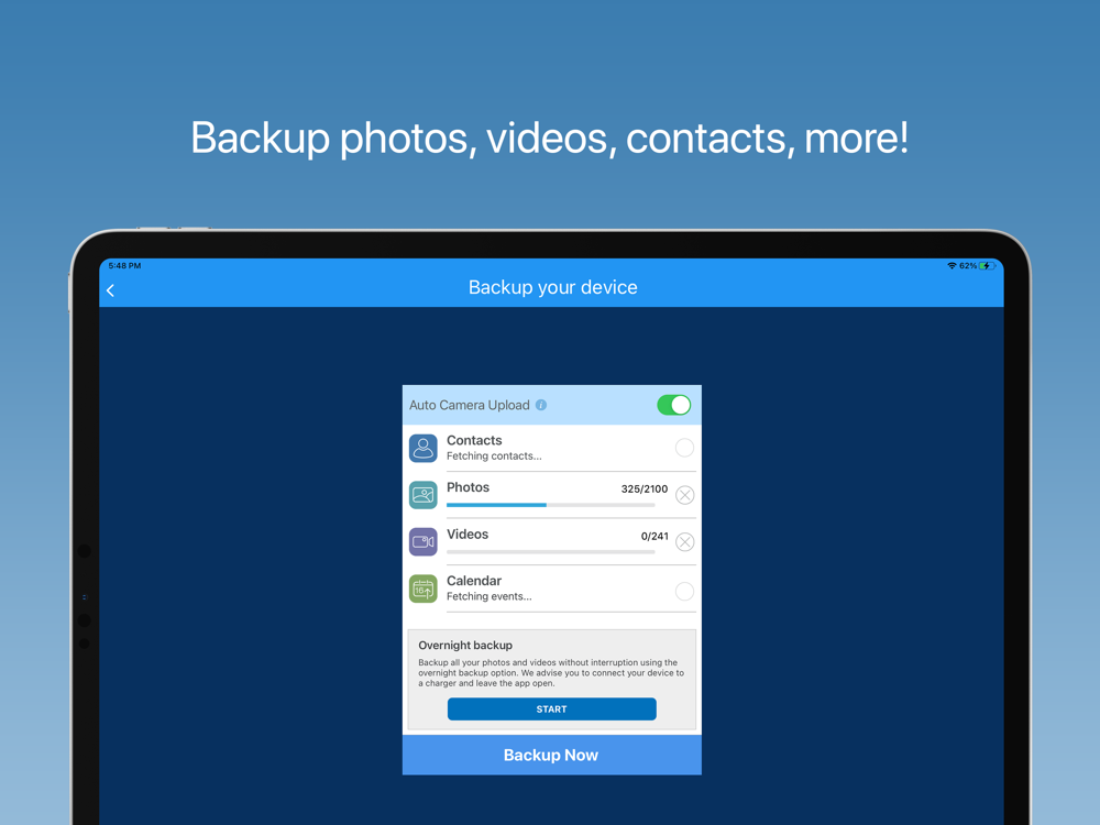 Automatically backup photos and videos from the device gallery with Auto Camera Upload feature