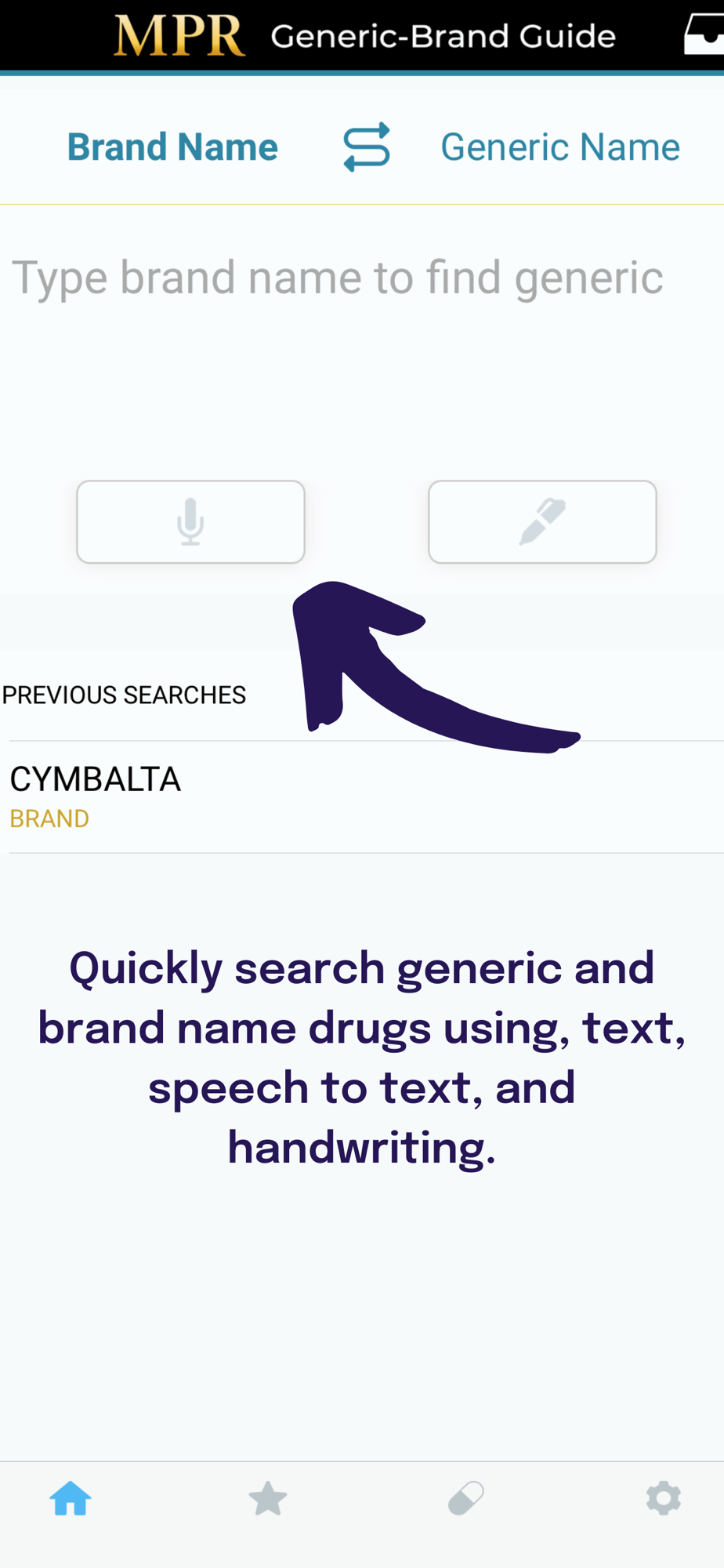 The Generic-Brand Guide, brought to you by MPR, is the most efficient pocket guide for translating generic and brand name drugs.The Generic-Brand guide contains information on thousands of brand name and generic drugs. Search thousands of generic and brand name drugs using voice and handwriting recognition. Generic-Brand Guide is powered by MPR, the brand trusted by over 800,000 healthcare professionals around the world.
