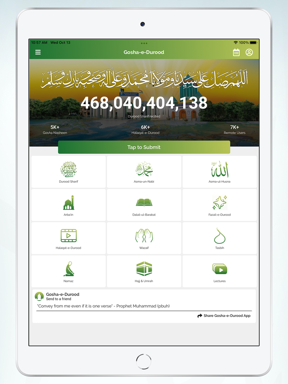 The Holy Prophet (peace and blessings be upon him) has showered countless blessings on Minhaj-ul-Quran International (MQI). The chief among them is the establishment of Gosha-e-Durood in the central secretariat. It is a place on earth after the Two Holy Mosques that is dedicated to offering greetings and salutations on the Holy Prophet (PBUH) round the clock, 24/7 and during 365 days of a year.