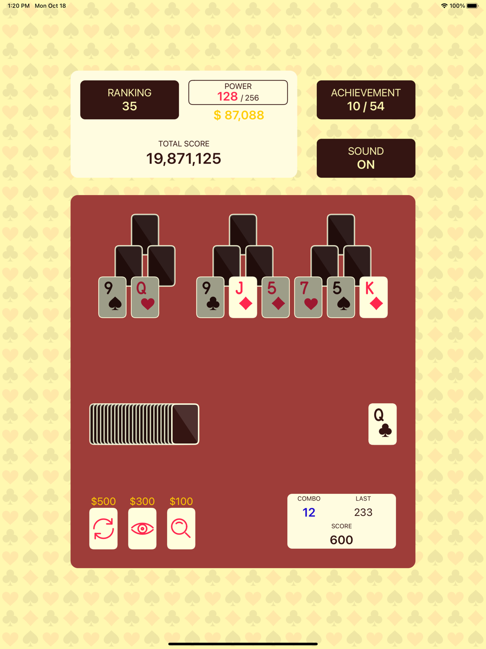 Solitaire game that requires good memory, skills and strategy to get high scores.