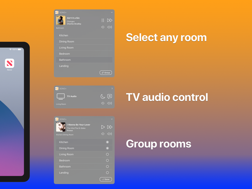Choose any room in your home and control volume, play/pause or skip tracks.