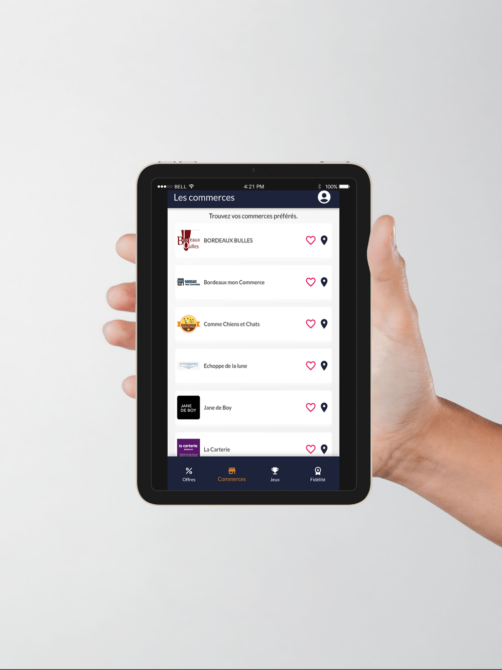 Bordeaux mon commerce est l’association fédérant l’ensemble des commerces de Bordeaux et ce quel que soit leur typologie : indépendants, enseignes, franchisés, tout type de commerce. Elle souhaite, avec l’aide de ses partenaires, développer une application qui permettra aux commerçants bordelais de communiquer directement avec leurs clients. Il est apparu qu’une solution simple et efficace devait être développée : une application qui permettrait aux consommateurs de recevoir et connaître tous les bons plans que proposeraient leurs commerçants locaux. Cette technologie à base de pushs préalablement acceptés et de géolocalisation ne demande pas obligatoirement de données personnelles (en dehors de jeu), simplement à terme un choix préalable de leurs centres d’intérêts (alimentaire, déco, services, etc…).
