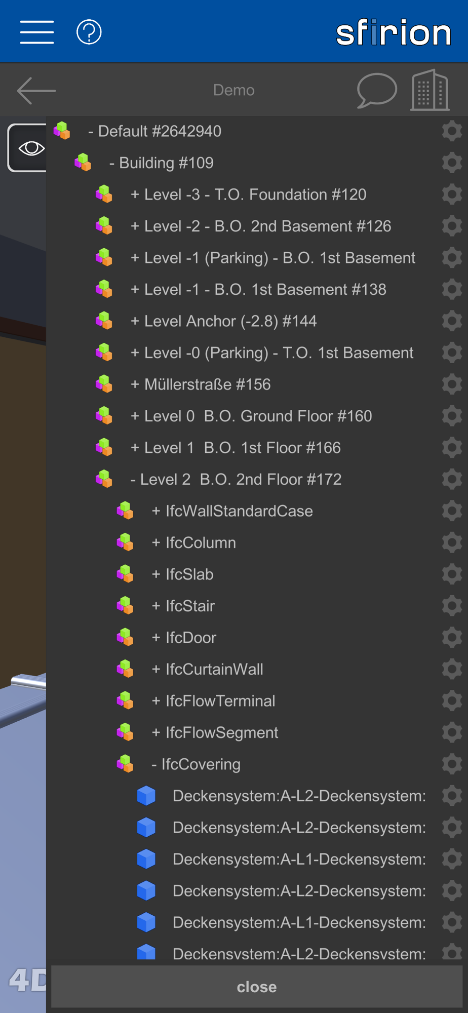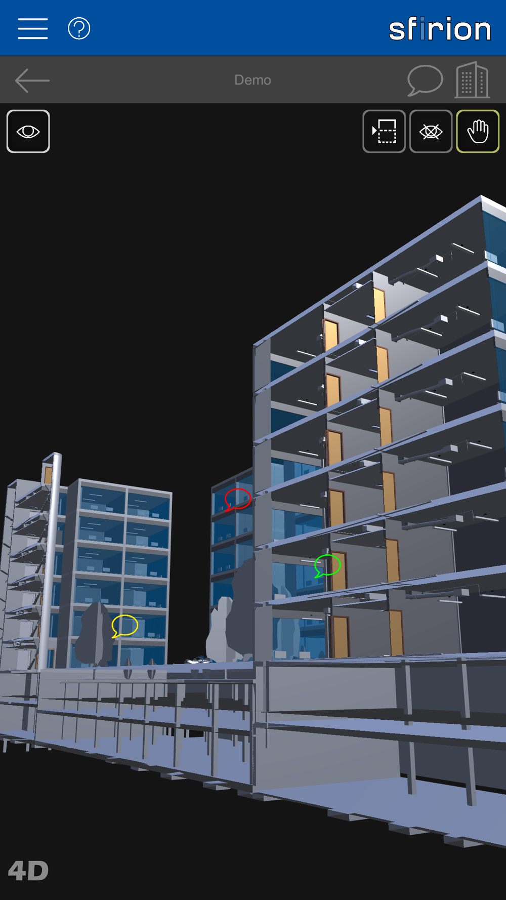 With the sfirion BIM app, you can import, view, share, comment on, and enrich IFC models with photos and documents. If the IFC file also contains schedule information and the corresponding links to the components, the 4D simulation can be played in the viewer.