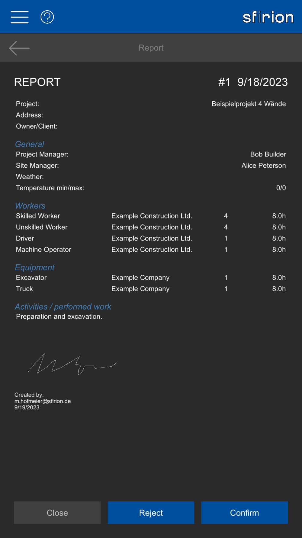 Create daily reports for the planning or construction process. Depending on your role, you have the option to create or read and countersign reports. Reports are automatically distributed via the app and email as PDFs.