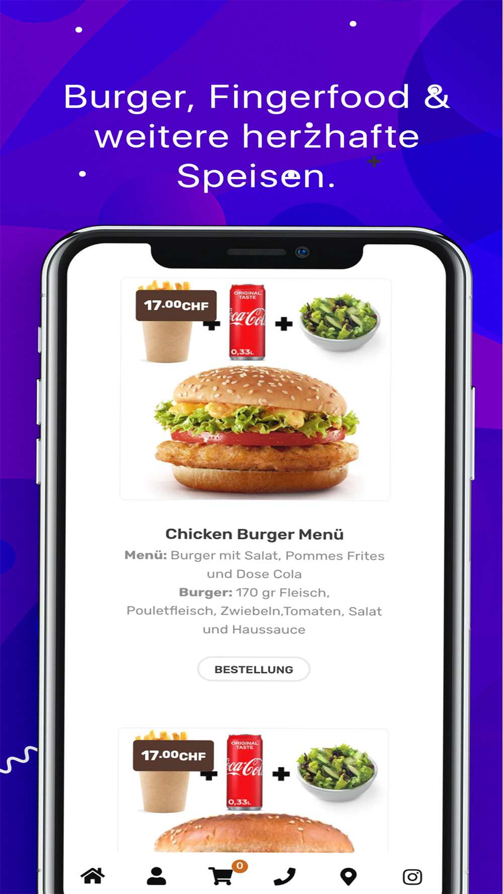 Gleich downloaden, Essen bestellen und unsere leckere Burger geniessen. Guten Appetit!