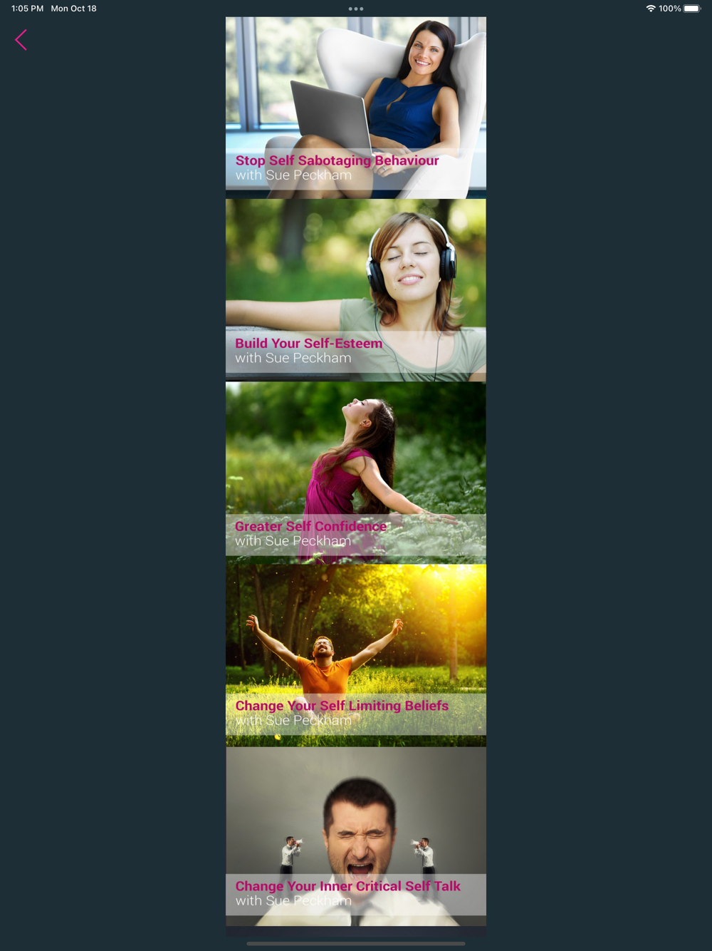 - Over 50 unique mindful meditation and hypnosis sessions, focusing on areas such as relaxation, sleep, confidence, exercise, weight loss, fears a& phobias, love & relationships.