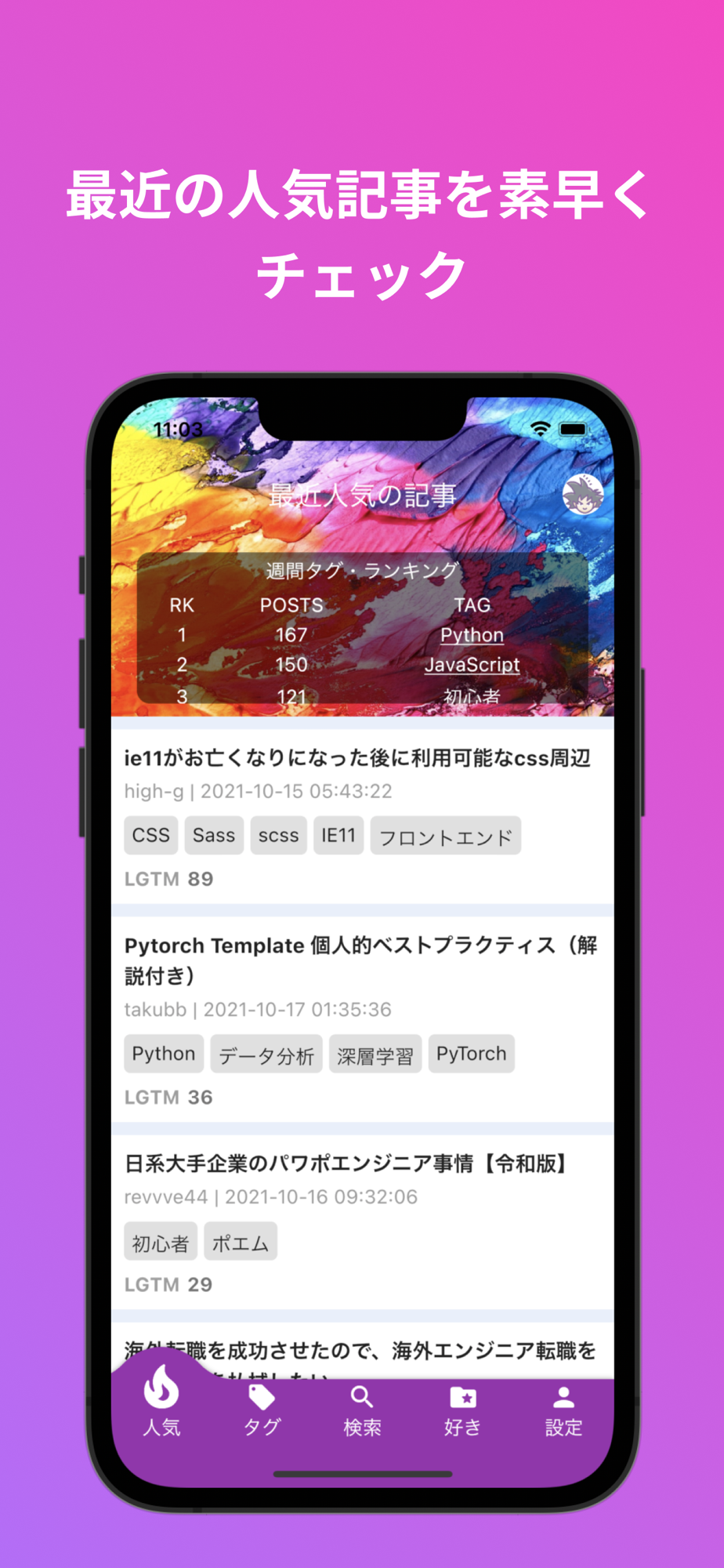 1.最近の人気記事をQiitaサイトと同時にお届けします。さらに、週間人気タグランキングも掲載しており、ワンタップでそのタグに付いた人気記事リストもチェック可能。