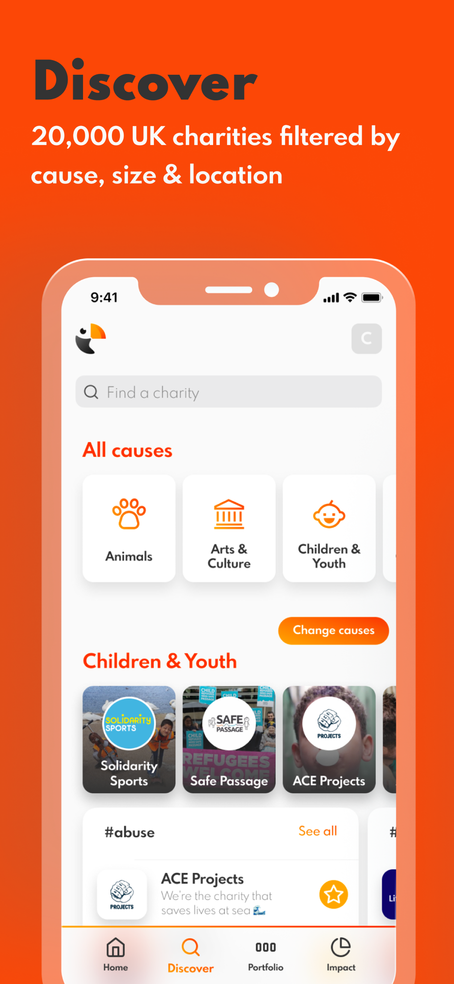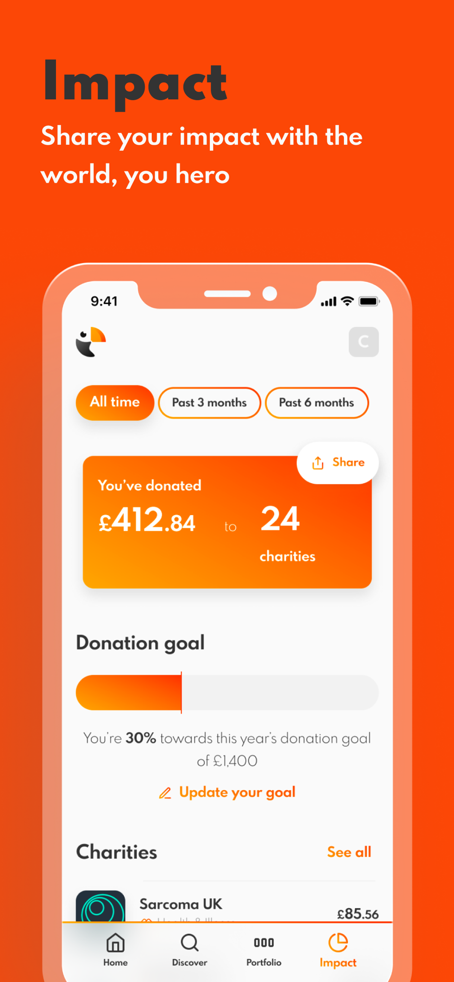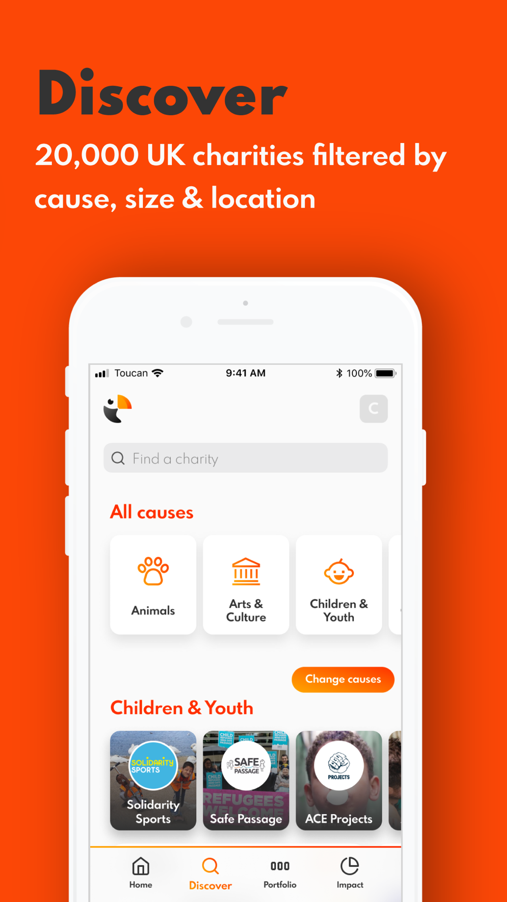 Toucan lets you create a giving portfolio of up to three charities and split a monthly donation between them. Choose from thousands and support them long term or play the field and switch it up each month.