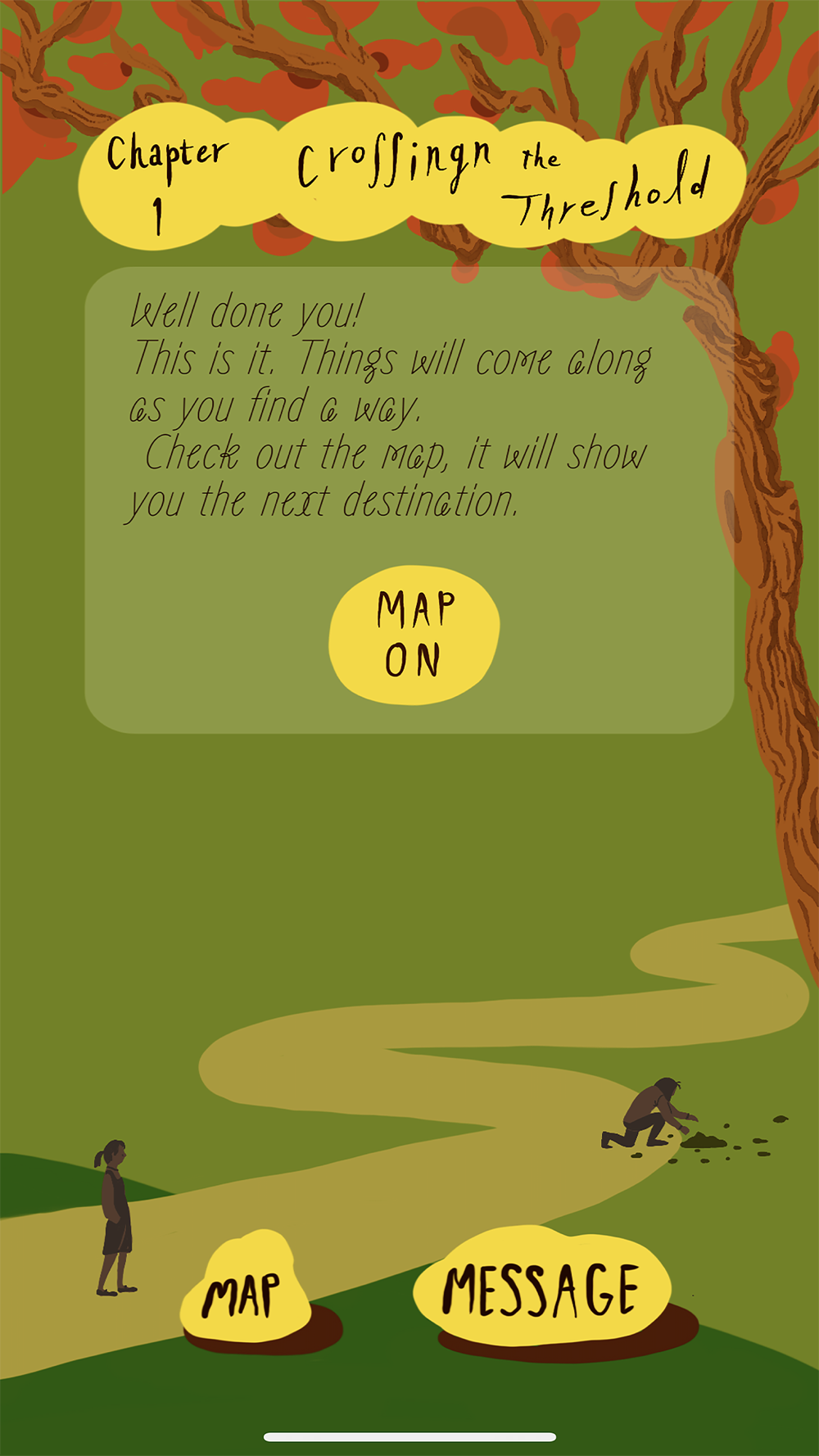 The audience’s virtual and live experience of the adventurous story proceeds as the mobile application with built-in GPS coordinates continues to sense the app users’ changing location within the venue. As the story develops, the participants are guided to follow a map on their mobile screen and move to designated spots, one after another. The interactive experience of the augmented reality and audio drama within the route will allow the audience to more closely interact with the virtual reality in the performance site.