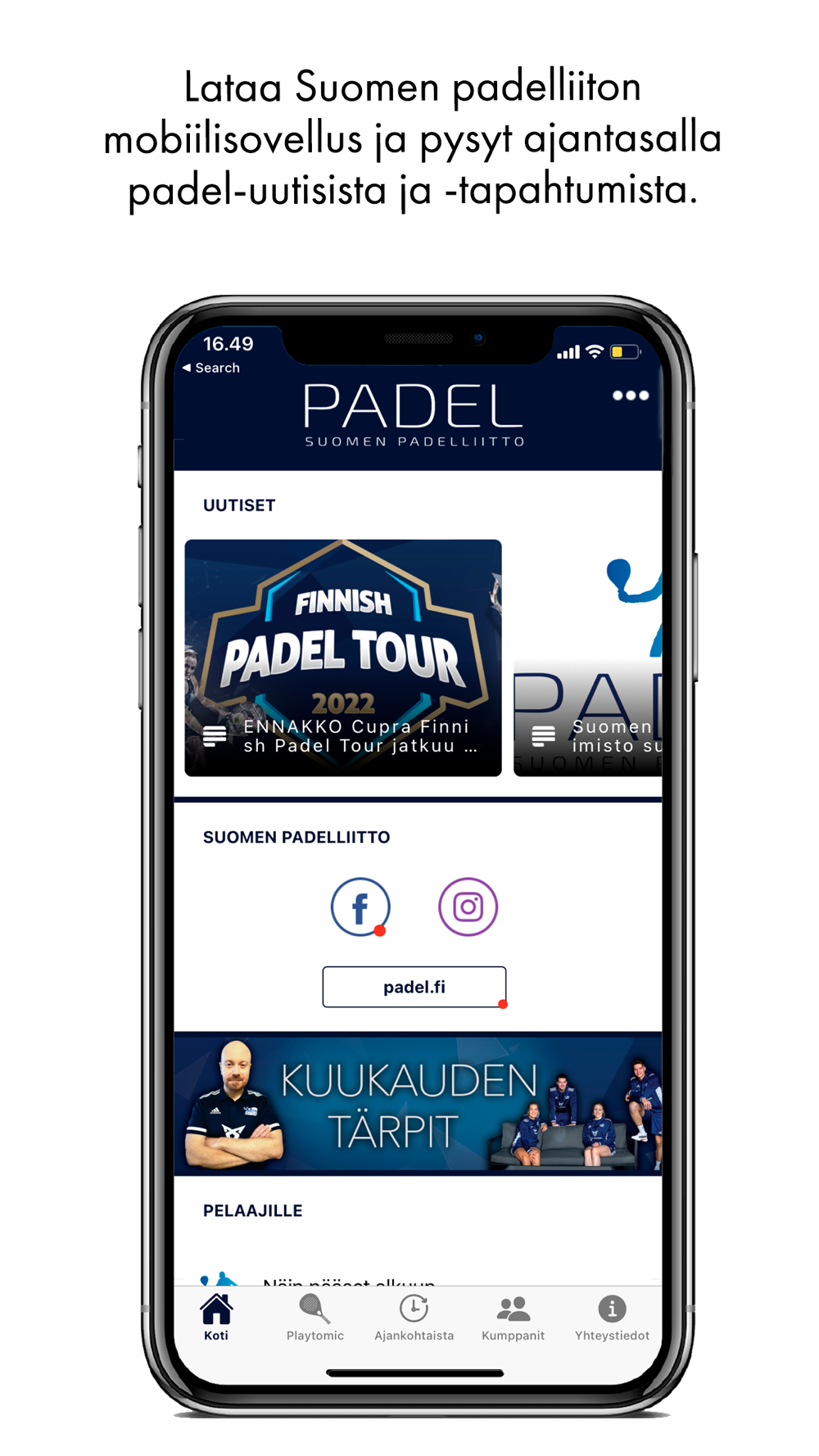 - Kaikki uusimmat uutiset padelliiton verkkosivuilta ja kaikista sosiaalisen median kanavista, sekä Cupra Finnish Padel Tourin somekanavista. Näitä sivuja pääset seuraamaan ilman sosiaalisen median tunnuksia ja kirjautumatta. Kaikista uutisista saat myös halutessasi push-ilmoituksia ja pysyt ajantasalla.