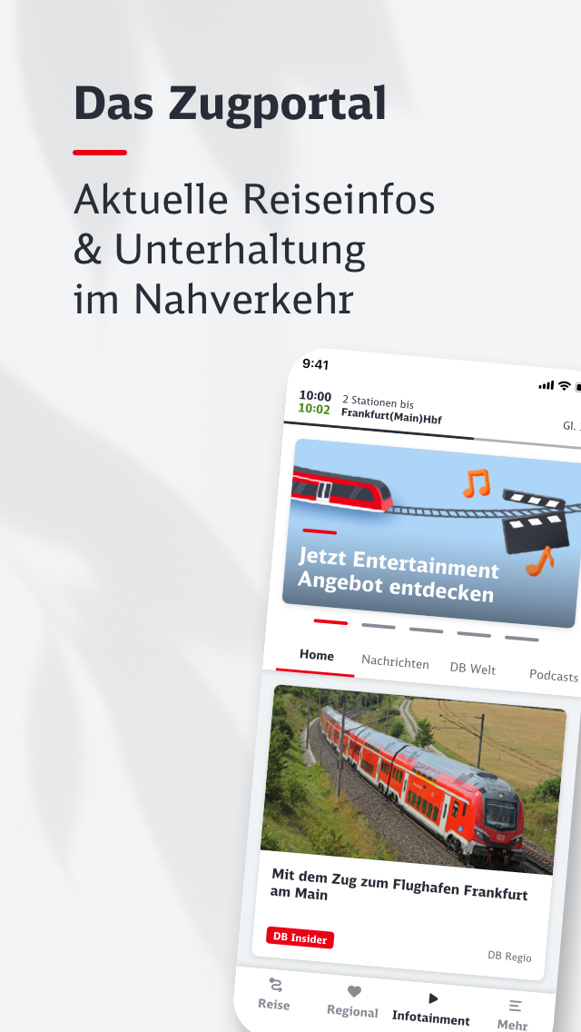 Mit dem Zugportal der DB Regio behalten unsere Kunden ihren Fahrtverlauf, regionales Geschehen und wichtige Informationen aus der Welt stets im Blick. Die Inhalte liegen zum Großteil auf den Servern im Zug, sodass Sie auch bei fehlendem Mobilfunkempfang vom Informations- und Unterhaltungsangebot profitieren können und auch Angebote wie Videos oder Podcasts störungsfrei abgespielt werden.