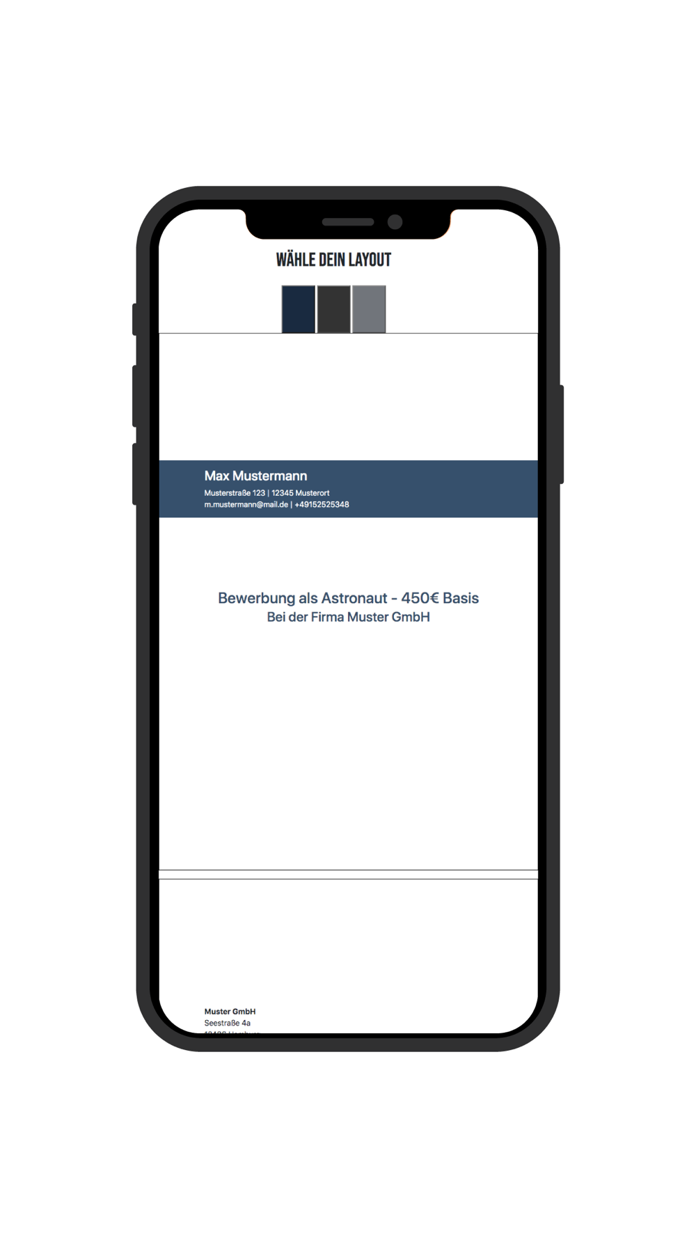 Auf der Startseite erhältst du eine Musterbewerbung die du dann Bearbeiten kannst. Du kannst diese Musterbewerbung bearbeiten oder als PDF via Email fertigstellen.
